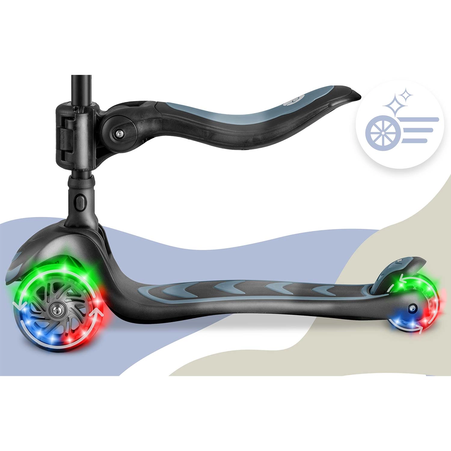 Skiro Nukido Flippo uporablja intuitivni balansirni sistem – zavija z nagibanjem telesa, ne z obračanjem krmila. Otroci tako hitro osvojijo tehniko vožnje in hkrati razvijajo ravnotežje in koordinacijo. Tri kolesa zagotavljajo odlično stabilnost tudi pri nižjih hitrostih, zato je skiro odlična izbira za začetnike.