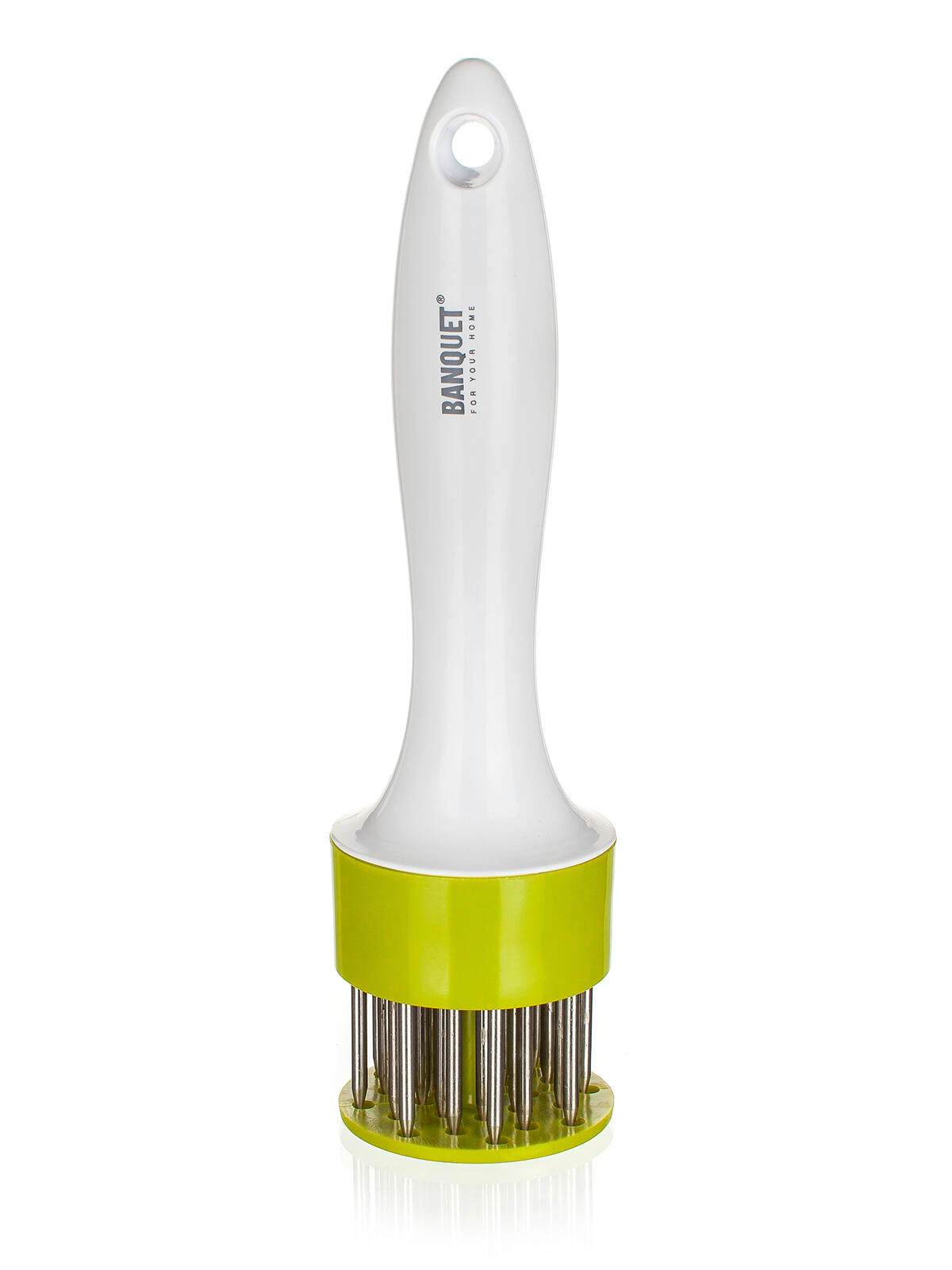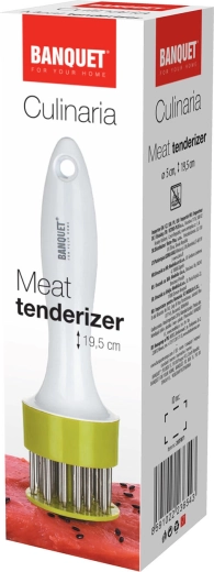 Praktičen mehčalnik mesa z ostrimi nerjavnimi iglami hitro prereže in skrajša vlakna, zato je meso nežno, sočno in bolje sprejema marinado. Ergonomski plastični ročaj in kompaktna zasnova olajšata delo v kuhinji ter skrajšata čas toplotne obdelave.