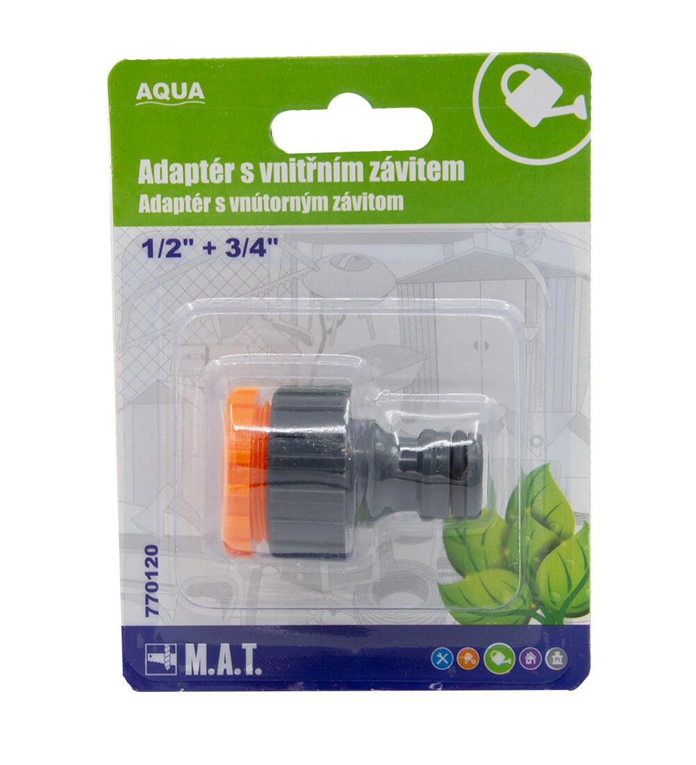 Adapter z notranjim navojem AQUA je praktična rešitev za povezovanje cevi s pipami ali vodovodnimi napeljavami. Z dvema običajnima velikostma navojev 1/2" in 3/4" pokrije večino domačih in vrtnih aplikacij ter olajša namestitev namakalnih sistemov.