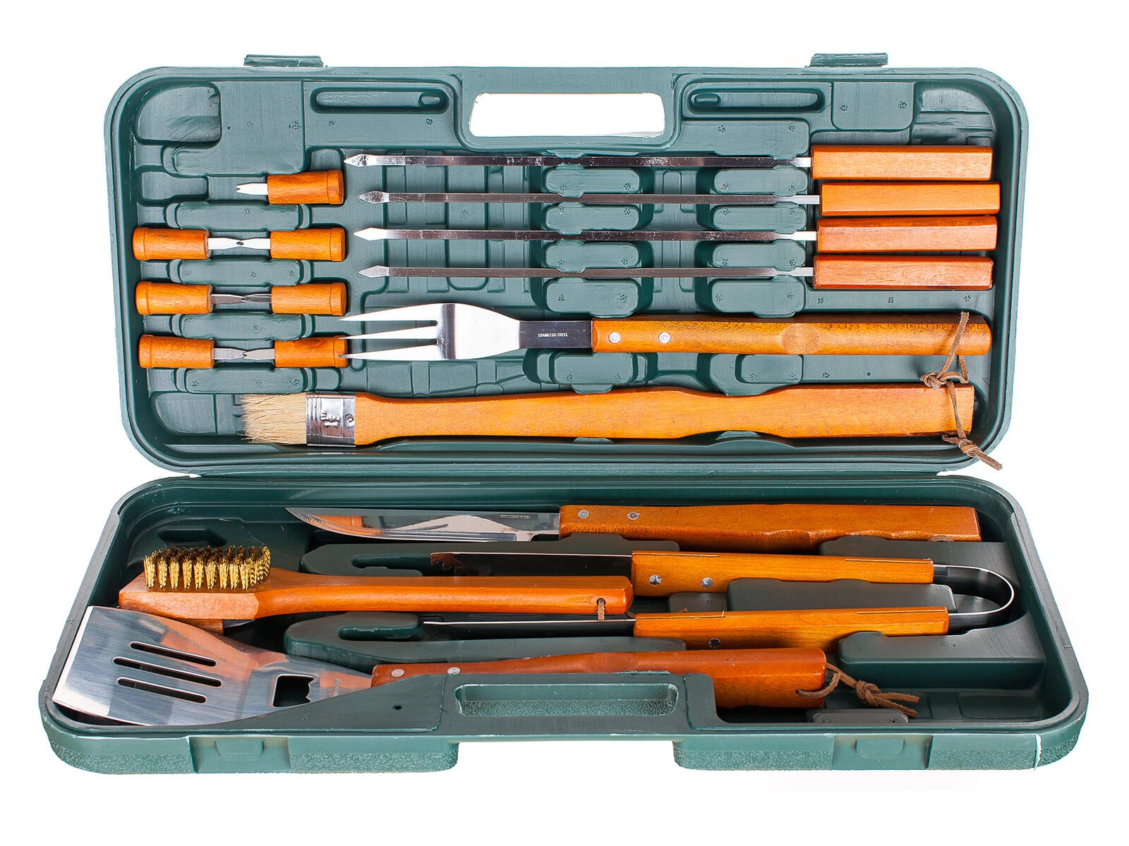 - Čistilna žičnata krtača 29 cm; klešče 34 cm; lopatka 41 cm; rezalni nož 44 cm; vilice s 3 konicami 40,5 cm; 4× žar nabodalo 40,5 cm; 8× ražnjič 6,5 cm; čopič 46 cm