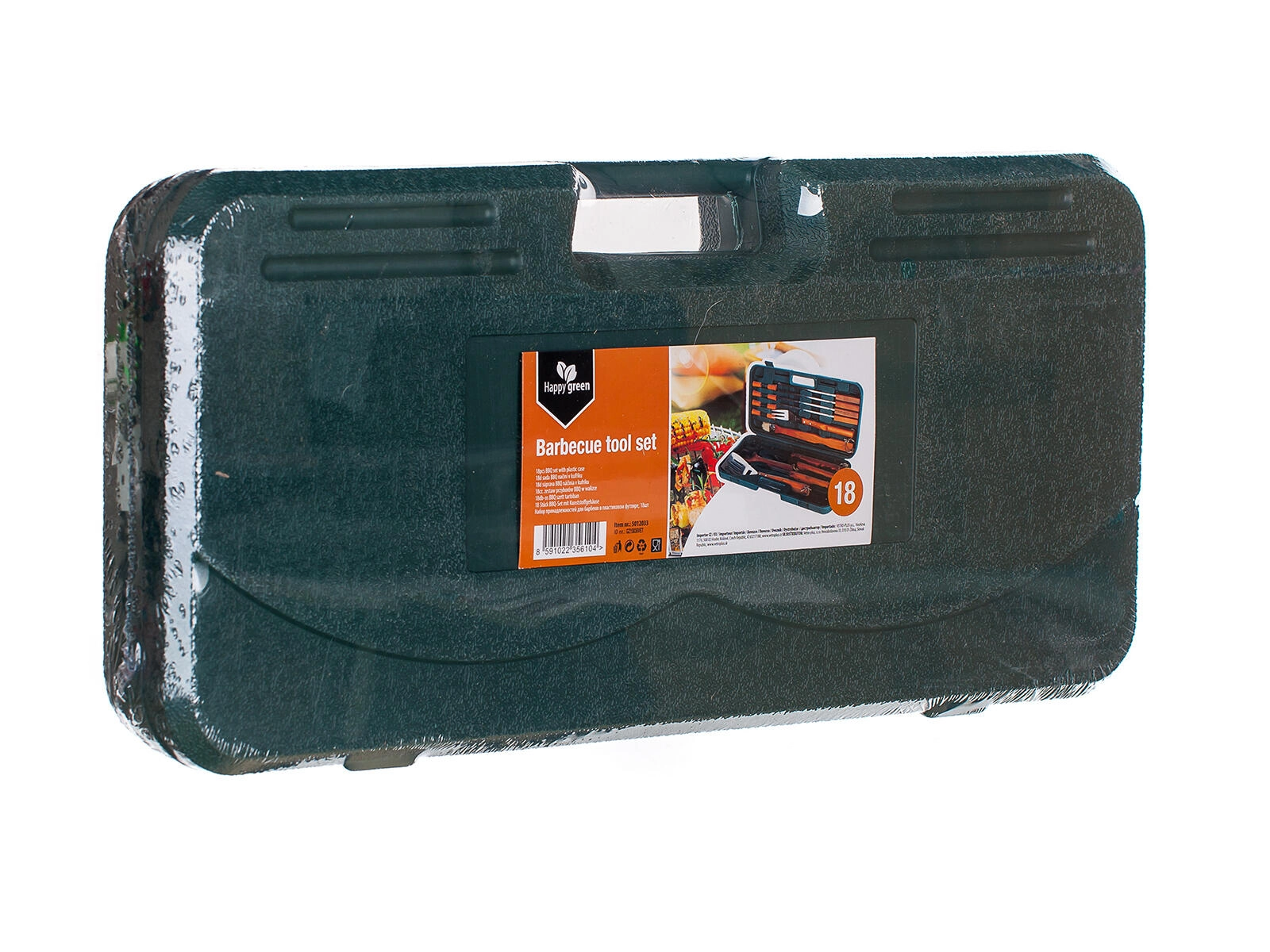 Celovit komplet za ljubitelje žara v praktičnem kovčku vsebuje vse potrebno za pripravo popolno pečenih jedi. Nerjavno orodje z udobnimi lesenimi ročaji je odporno, varno in enostavno za vzdrževanje. Zahvaljujoč dolgim orodjem, zankam za obešanje in pregledni razporeditvi v kovčku je peka na žaru udobna in organizirana. 18-delni komplet, nerjavna jekla, leseni ročaji, praktičen plastičen kovček.