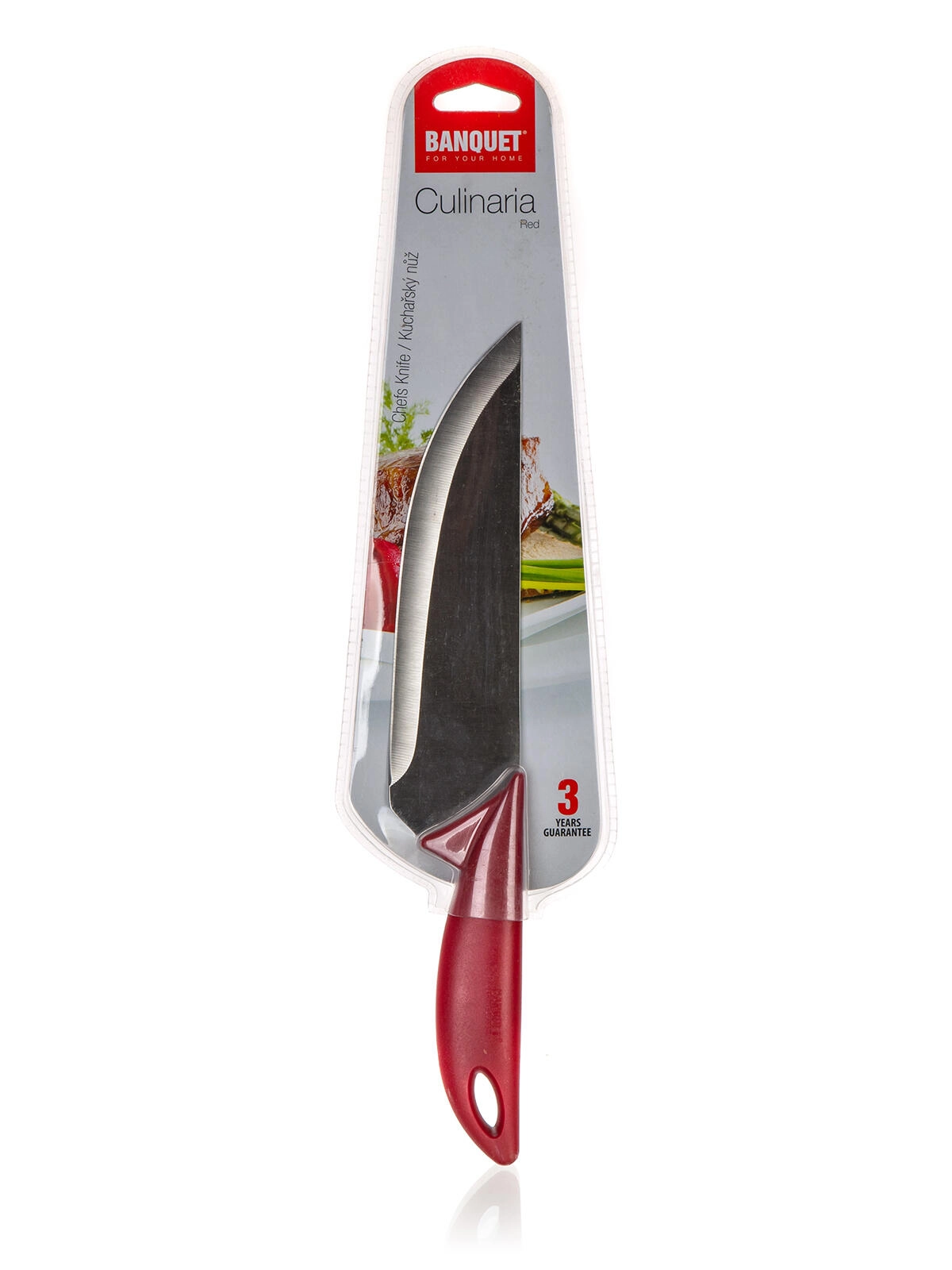 Kuharski nož iz linije CULINARIA RED je zanesljiv pomočnik za pripravo mesa, zelenjave in zelišč. Jekleno rezilo zagotavlja čiste reze in dolgotrajno ostrino, medtem ko lahek plastičen ročaj prijetno sede v dlan in olajša nadzor nad rezanjem.