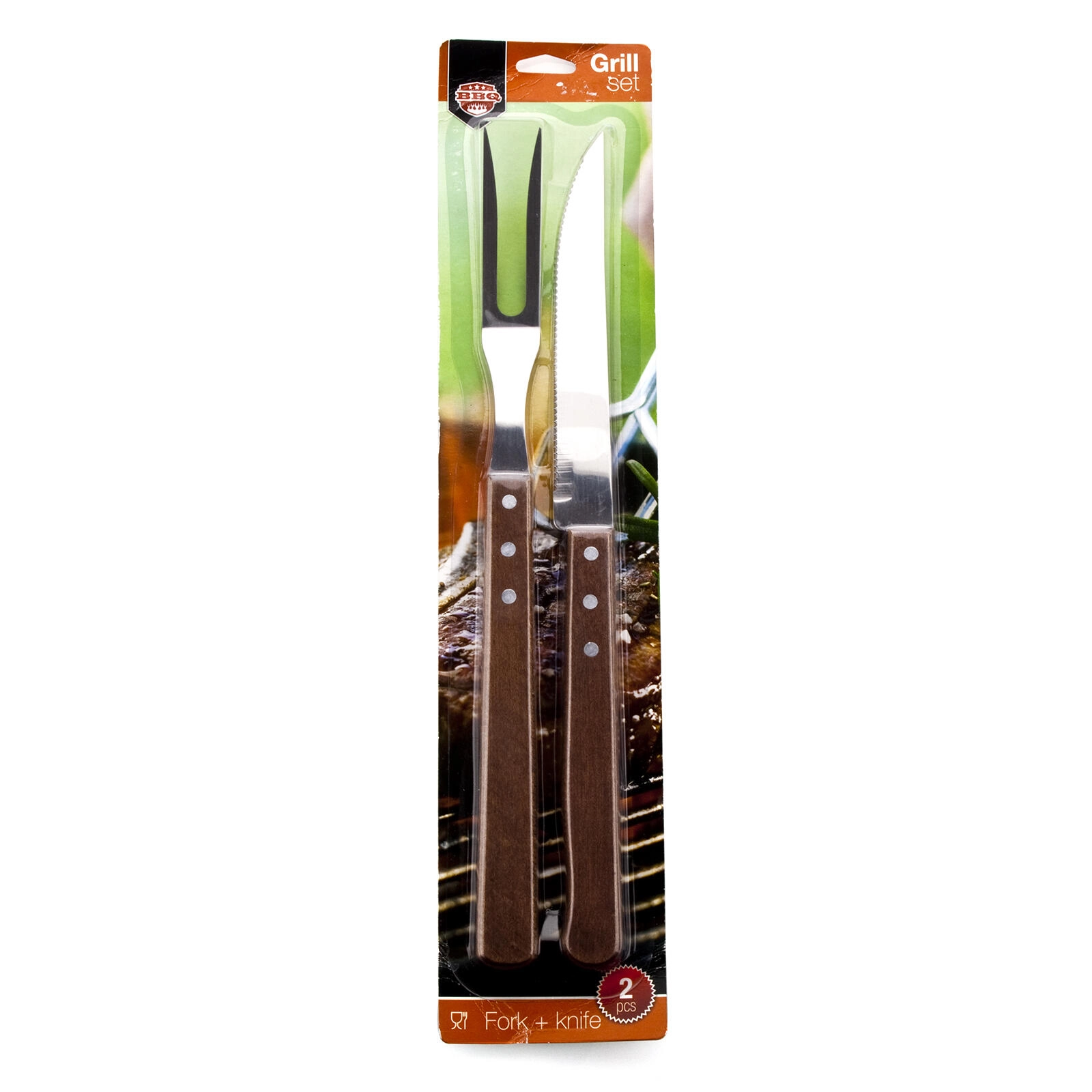 Praktičen steak set za žar vsebuje nazobčan nož in dvohrapne vilice iz nerjavnega jekla z ergonomskimi lesenimi ročaji. Idealno za rezanje steakov, porcioniranje in manipulacijo z mesom pri žaru ali za mizo. Odporna izdelava, udoben oprijem in rustikalni videz za stilsko zunanje obedovanje.