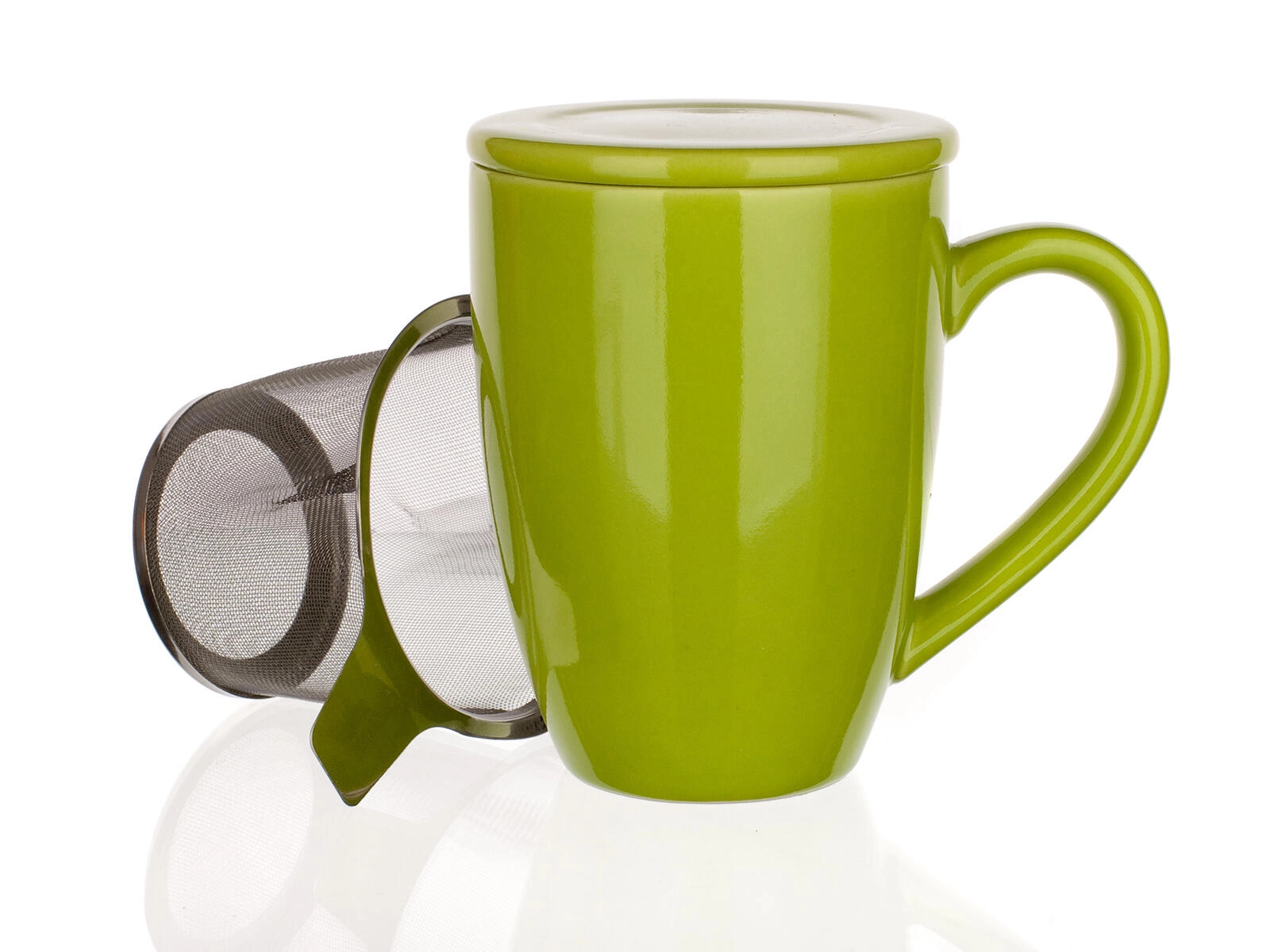 Stilska zelena skodelica BONNET s prostornino 350 ml s pokrovom in vgrajenim nerjavnim cedilom je idealna za ljubitelje razsutega čaja. Ponuja praktično namakanje neposredno v skodelici, ohranjanje temperature zahvaljujoč pokrovu in preprosto vzdrževanje – primerna je za pomivalni stroj in mikrovalovno pečico.