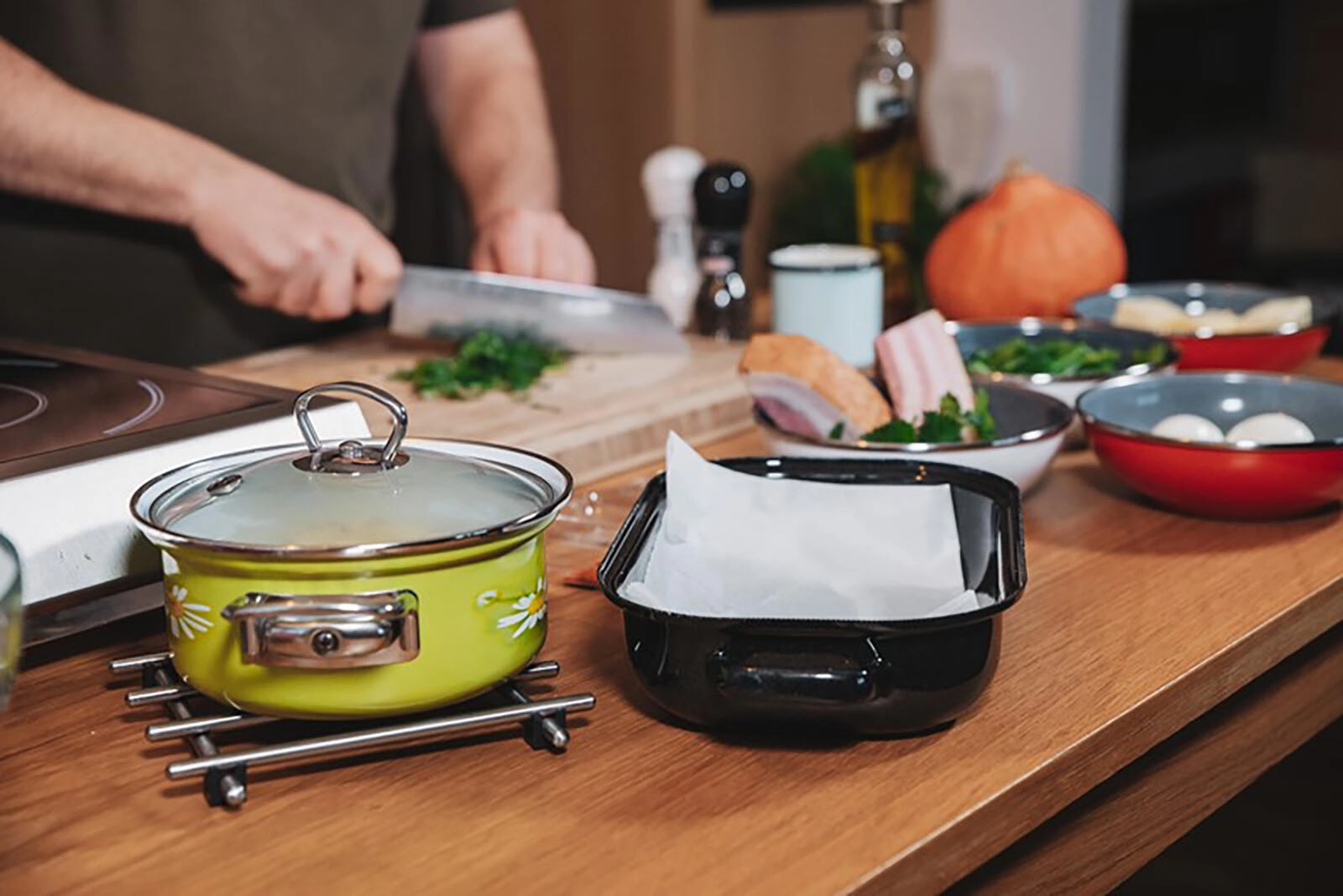 Gladek emajliran površinski sloj je trpežen, neporozen in enostaven za čiščenje – primeren za pomivalni stroj in varen za alergike.