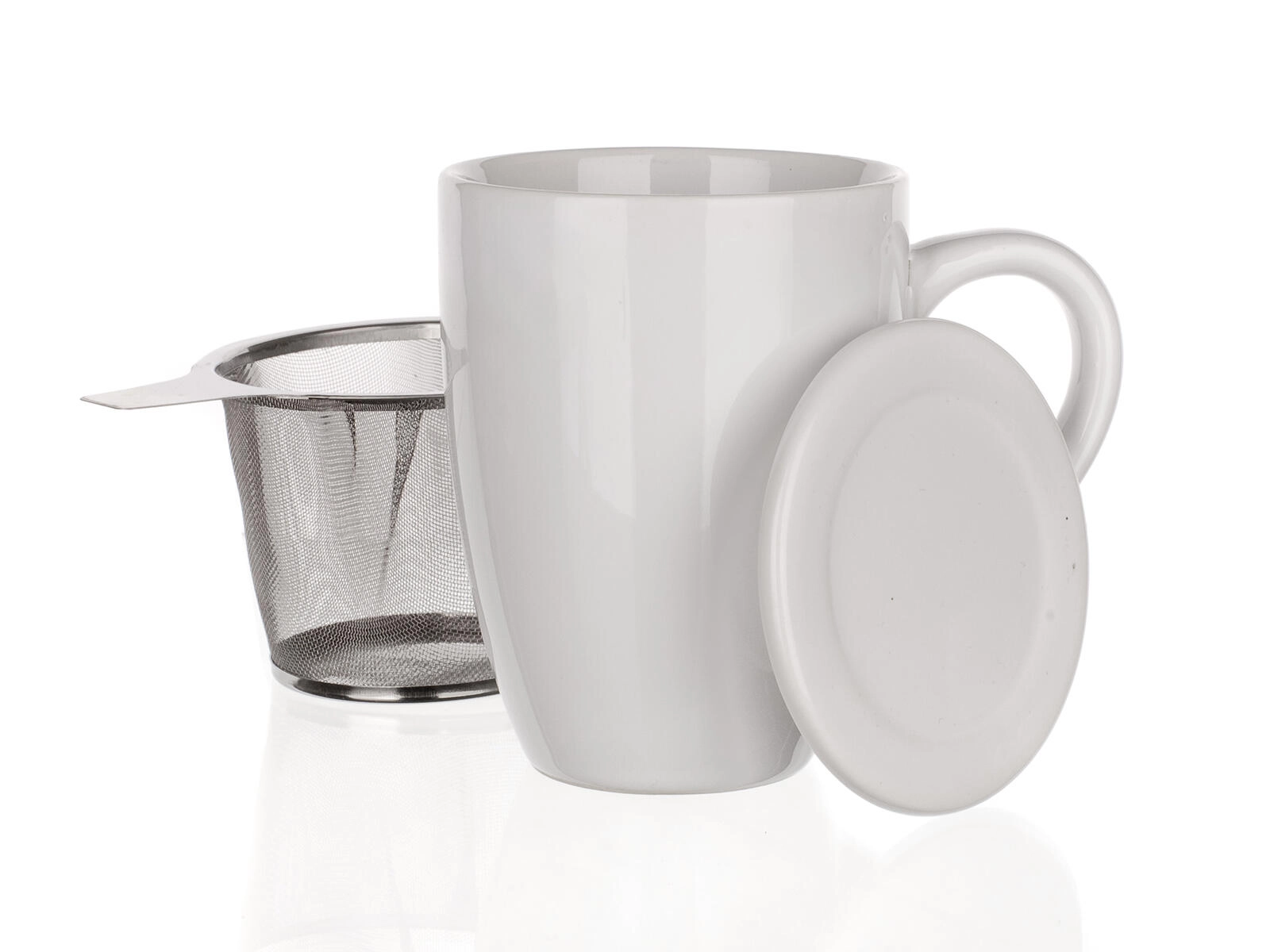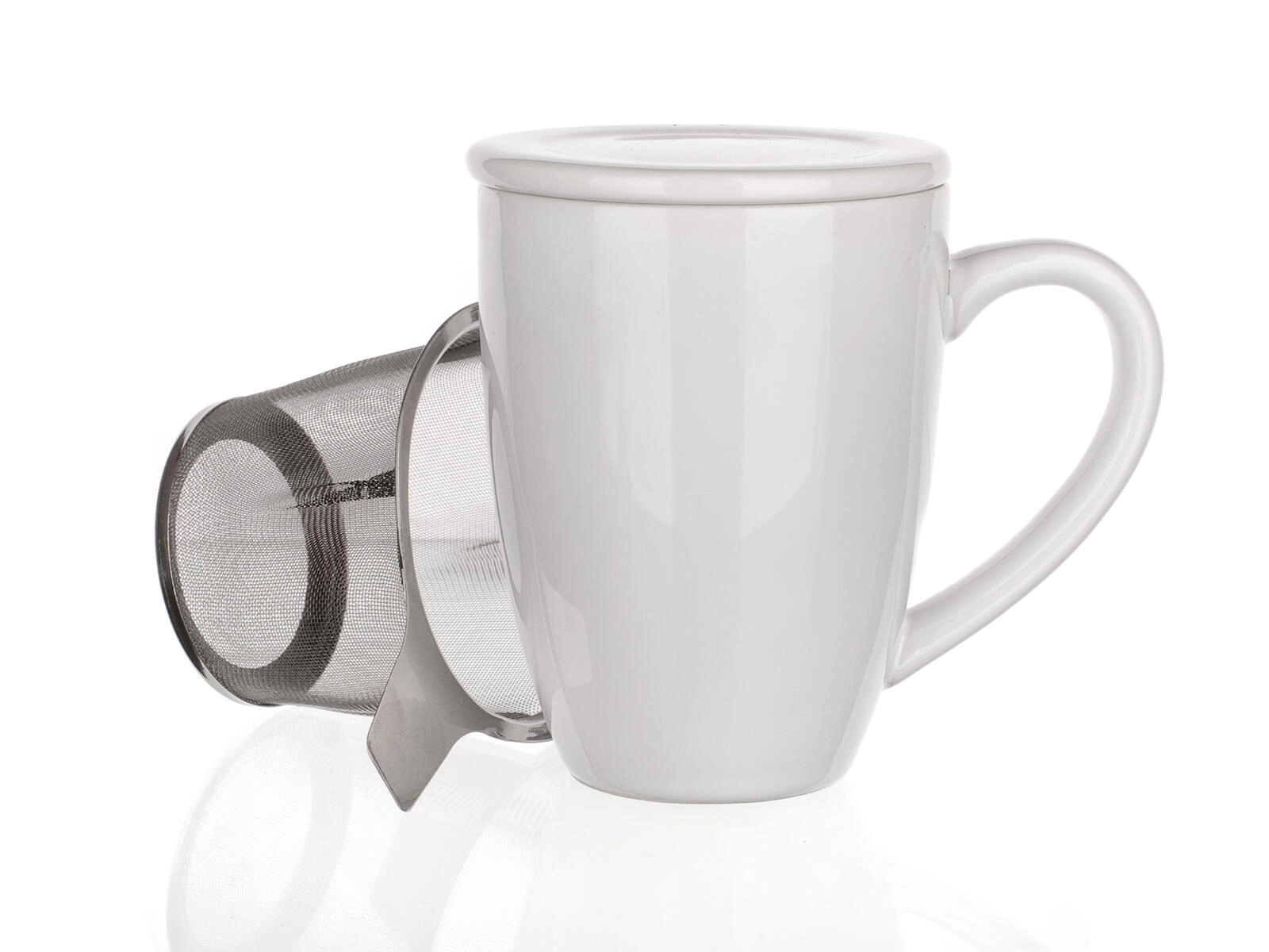 Ta bela keramična skodelica s prostornino 350 ml je odlična izbira za ljubitelje razsutih čajev. Odstranljivo nerjavno cedilo z drobno mrežico zagotovi čist preliv brez nečistoč, pokrov pa pomaga dlje ohranjati napitek vroč. Po namakanju lahko pokrov uporabite tudi kot priročno odlagalno posodico za cedilo.