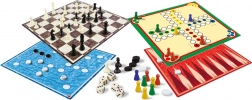 Paket vsebuje: 2 obojestranska igralna načrta (4 igralne površine), 32 šahovskih figur v dveh barvah, 16 figur v štirih barvah, 30 daminih ploščic v dveh barvah, 6 igralnih kock s pikami, 1 navodila.