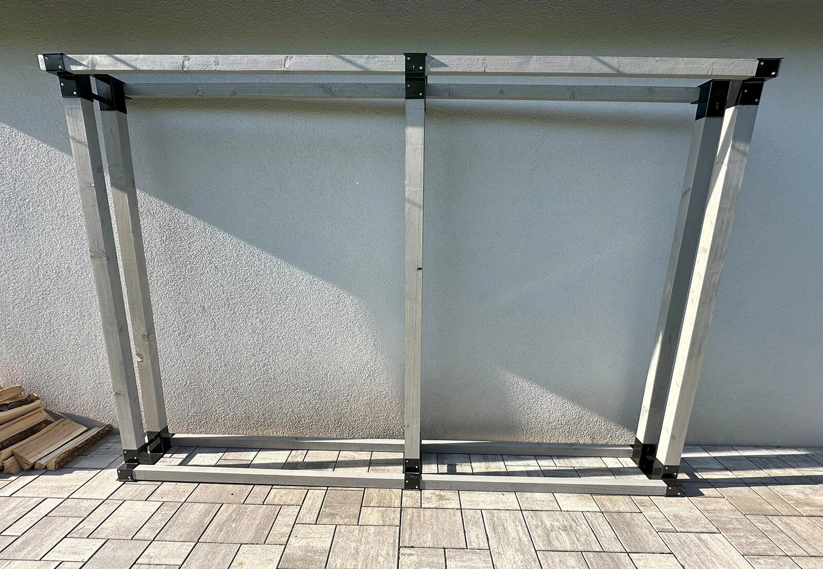 Montaža je hitra in prilagodljiva – le vstavite lesene letve v odprtine ter izberite dolžino po potrebi. Lesene povezave in bočnice niso vključene v pakiranje (ilustrativno). Za popoln okvir je potrebno uporabiti vsaj dva kosa stojal.