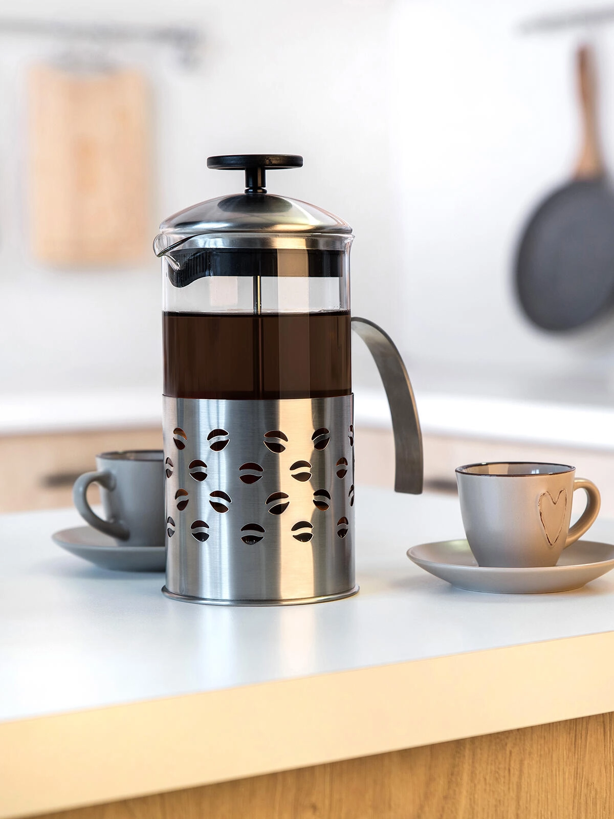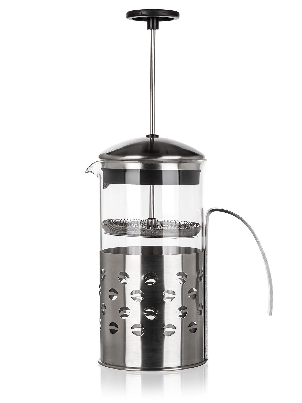 Stabilno kovinsko ohišje z udobnim ročajem olajša nalivanje in ščiti stekleno posodo. Primerno za pripravo več skodelic hkrati.