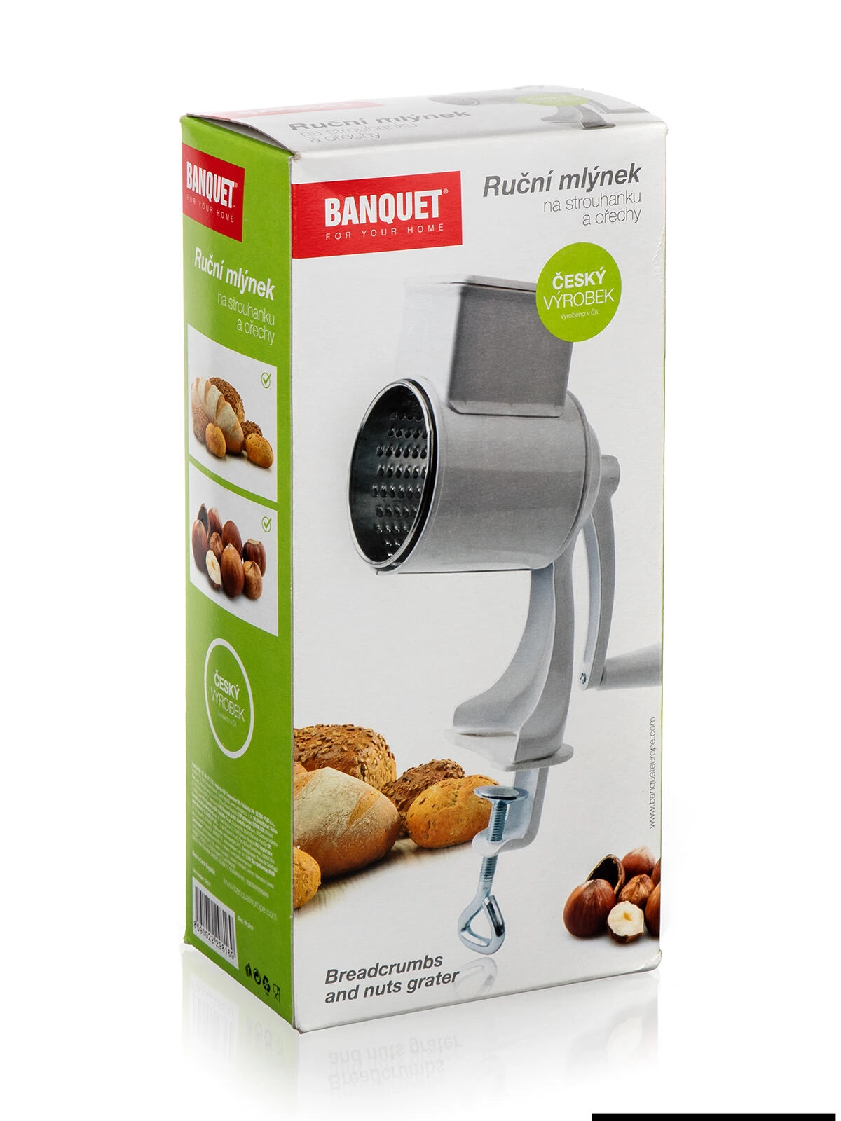 Ročni mlinček za drobtine BANQUET je idealen za vsakodnevno uporabo – od fine drobtine iz pekovskih izdelkov do hitrega drobljenja trdih sirov in oreščkov. Kovinsko ohišje z odporno površinsko obdelavo ter pocinkan boben zagotavljata dolgo življenjsko dobo in enostavno vzdrževanje.