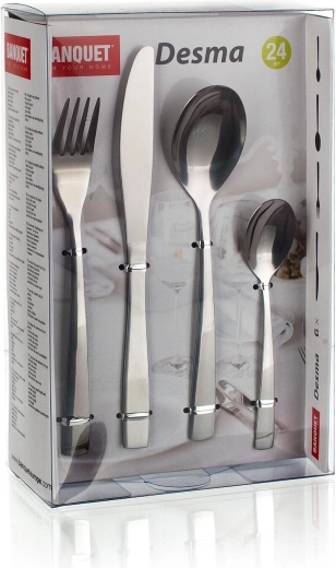 Eleganten 24-delni set jedilnega pribora DESMA za vsakodnevno obedovanje in slavnostne priložnosti. Kakovostno nerjavno jeklo s površinsko obdelavo visok sijaj zagotavlja dolgo življenjsko dobo in enostavno vzdrževanje. V setu najdete vse potrebno za šest oseb: žlice, vilice, nože in čajne žličke s premišljeno debelino materiala za udobno uporabo.