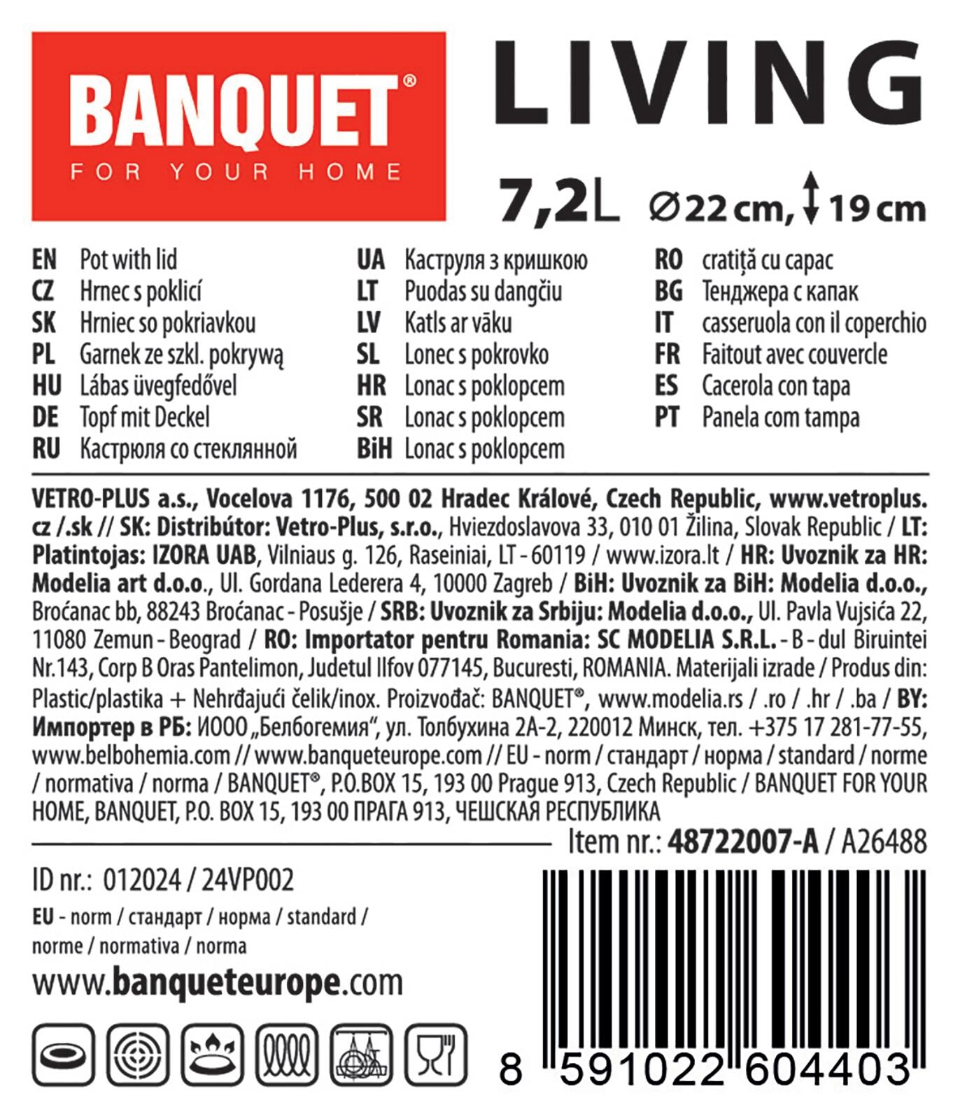 Praktičen nerjavno jeklen lonec LIVING s prostornino 7,2 l in premerom 22 cm je idealen za kuhanje juh, omak in testenin. Opremljen je s steklenim pokrovom z nerjavnim gumbom, univerzalnostjo za vse vrste kuhalnih plošč, vključno z indukcijo ter odpornim nerjavnim izvedbenim materialom z bleščečo površino in tremi mat trakovi za eleganten videz.