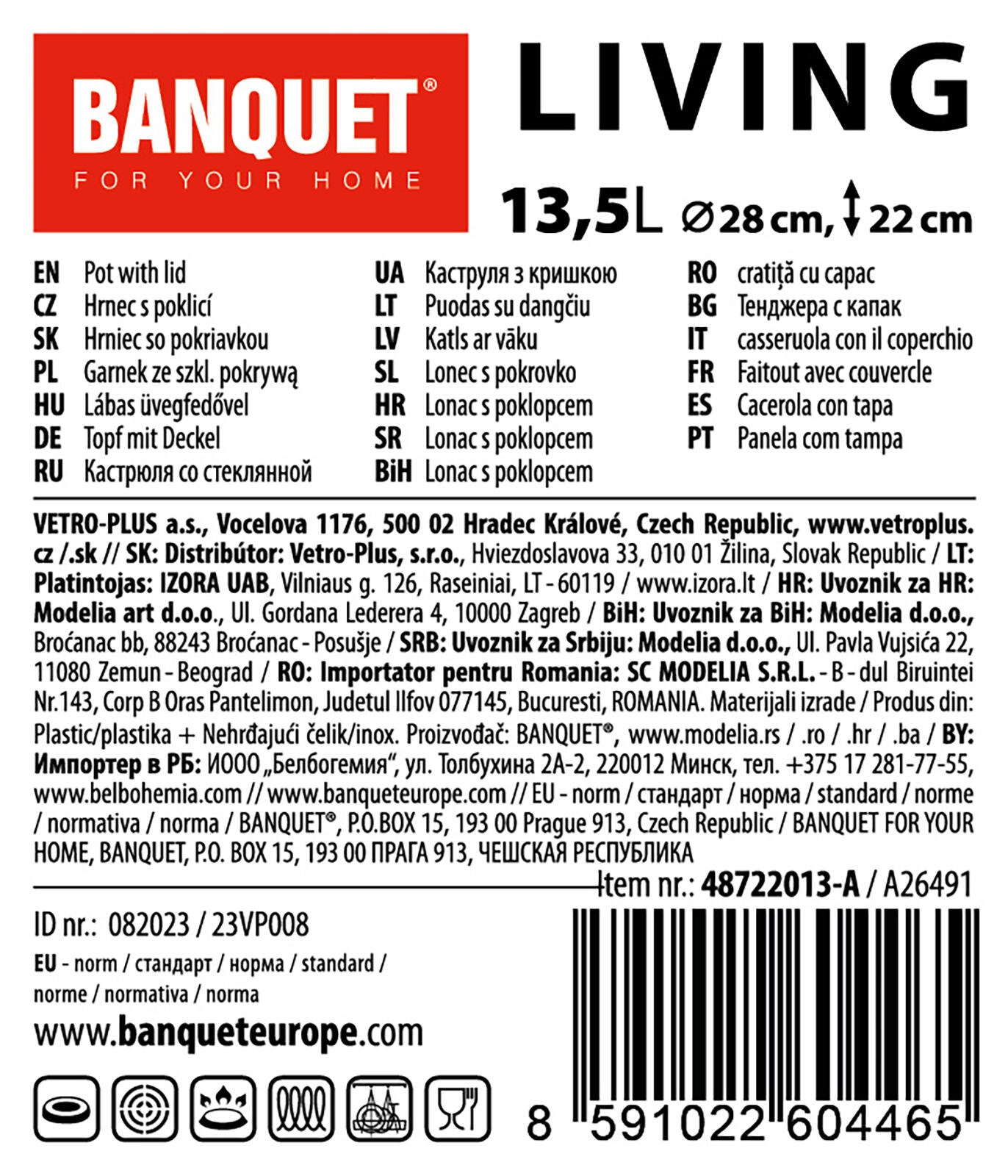 Prostoren nerjavnojekleni lonec LIVING s prostornino 13,5 l in s steklenim pokrovom je idealen za kuhanje juh, bistrih juh in večjih porcij. Ponuja premer 28 cm, kakovostno nerjavno jeklo 201, stekleni pokrov z nerjavno jeklenim gumbom ter združljivost z vsemi vrstami kuhalnih plošč, vključno z indukcijo.