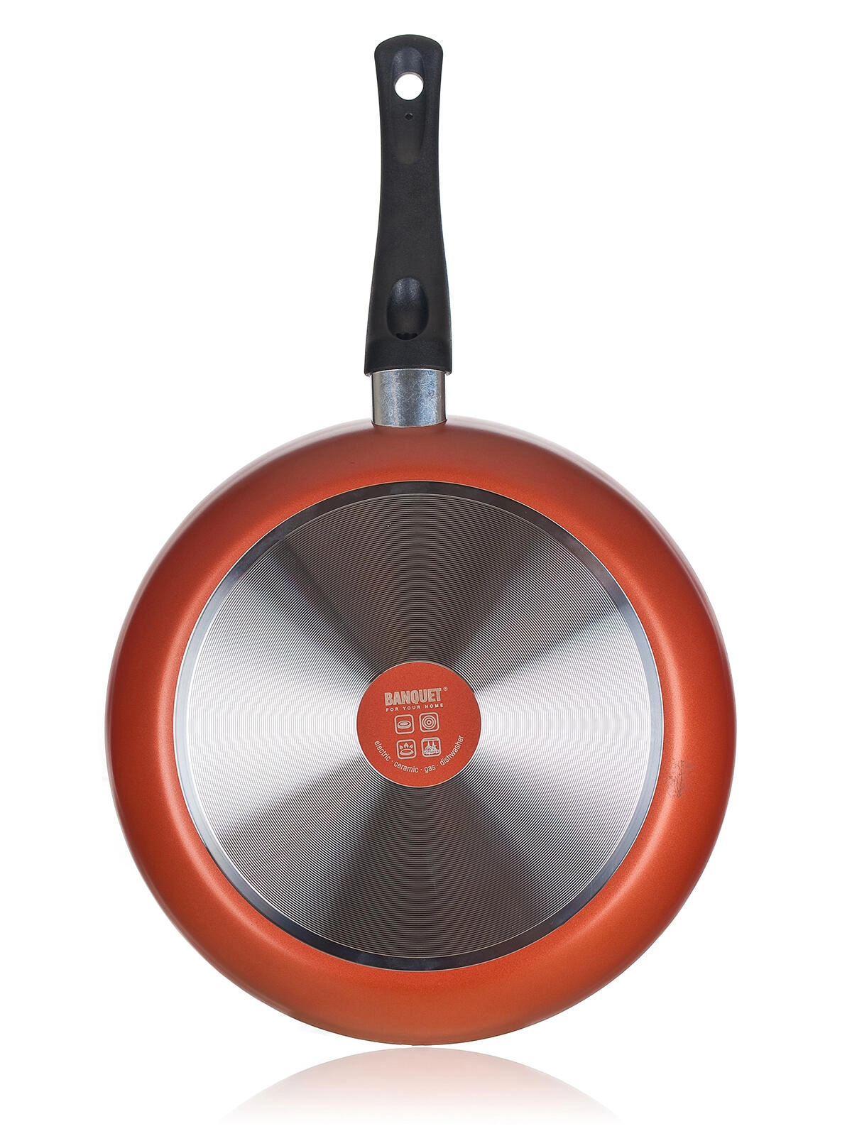 Aluminijasto telo je lahko in se hitro segreje. Črn bakelitni ročaj z zakovicami zagotavlja čvrst in varen oprijem.