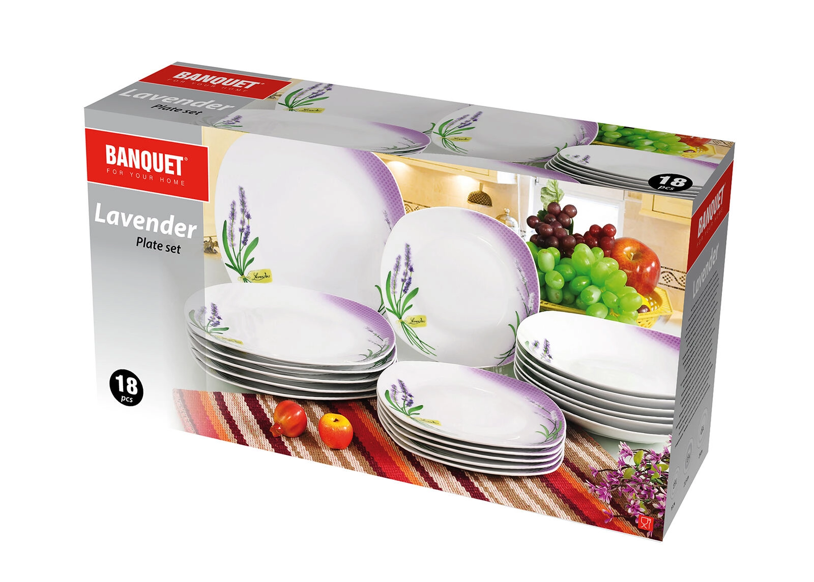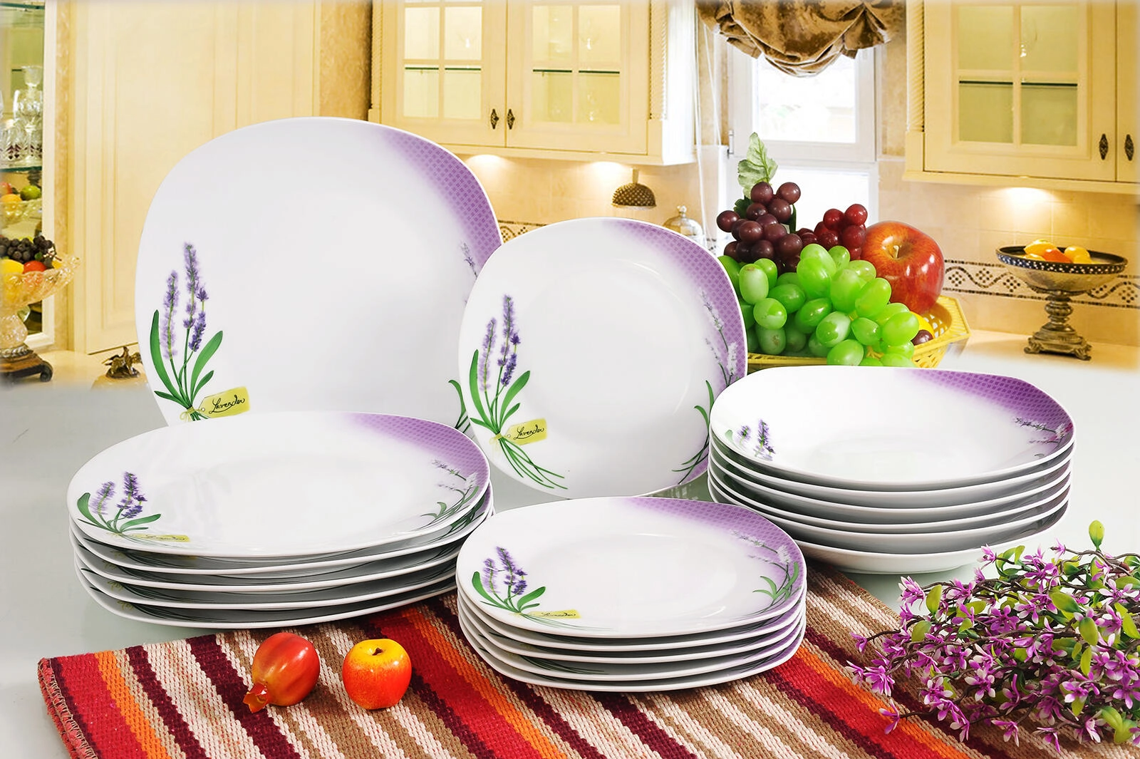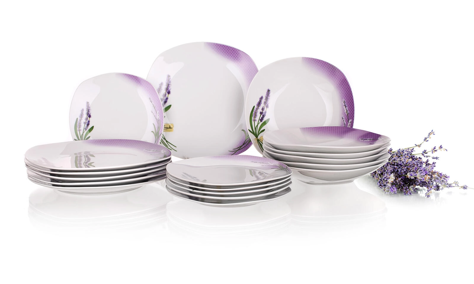 18 delov vključuje globoke, plitke in desertne krožnike – vse usklajeno v enotnem dizajnu Lavender Square za popolno mizo vsak dan.