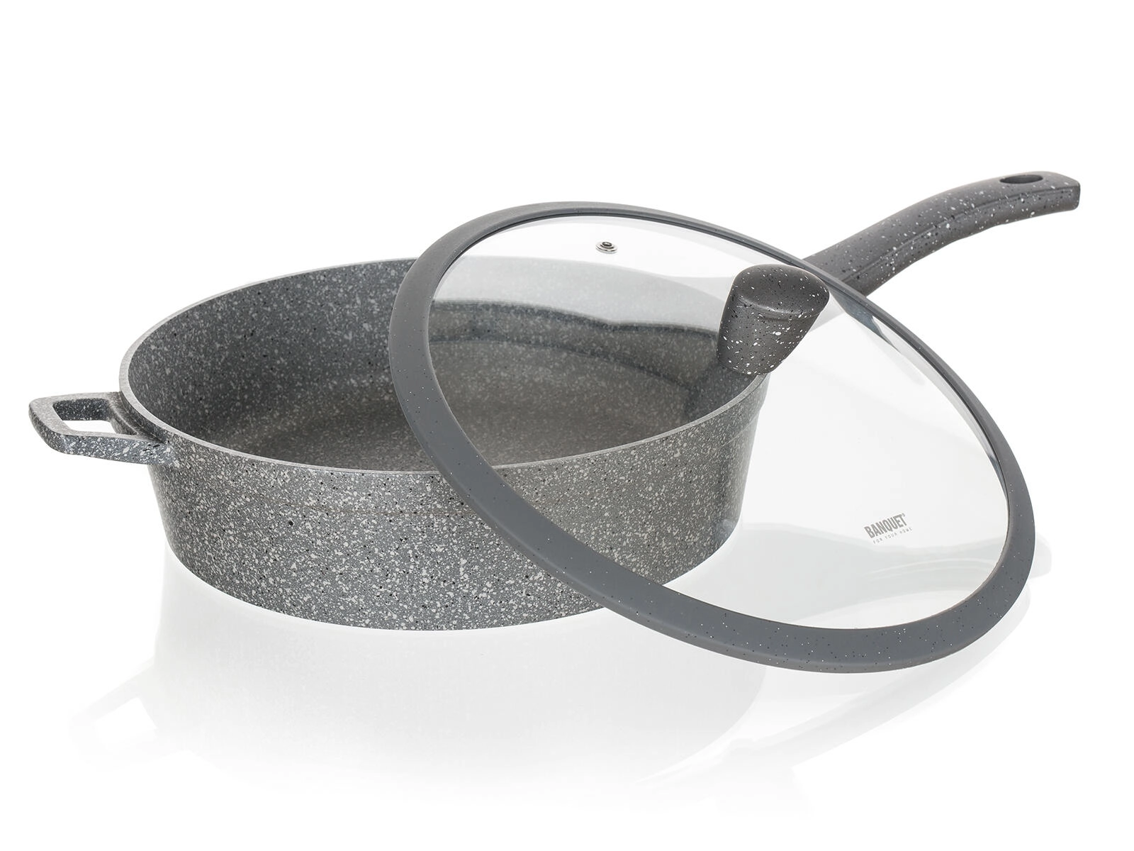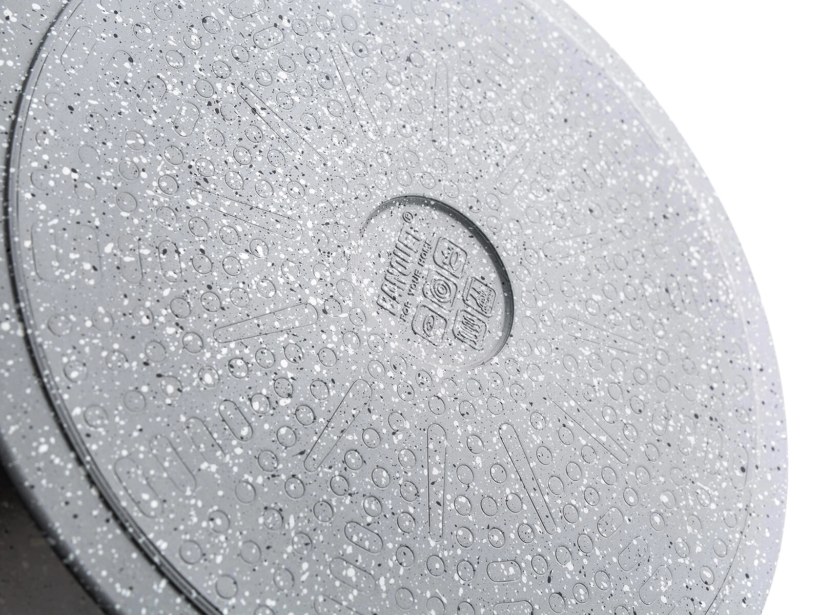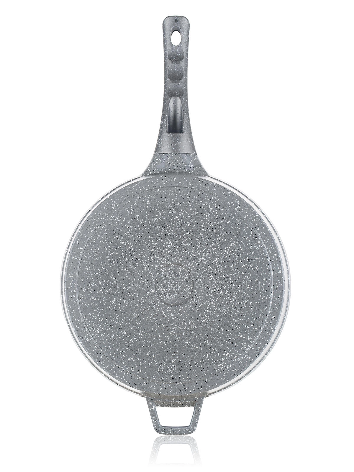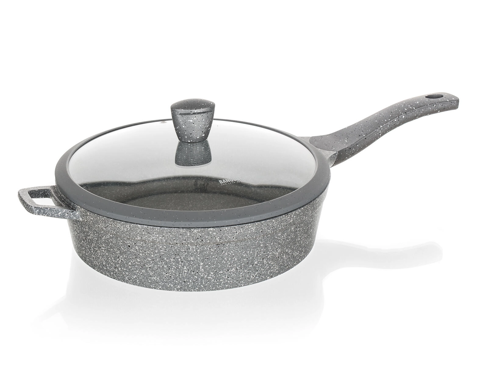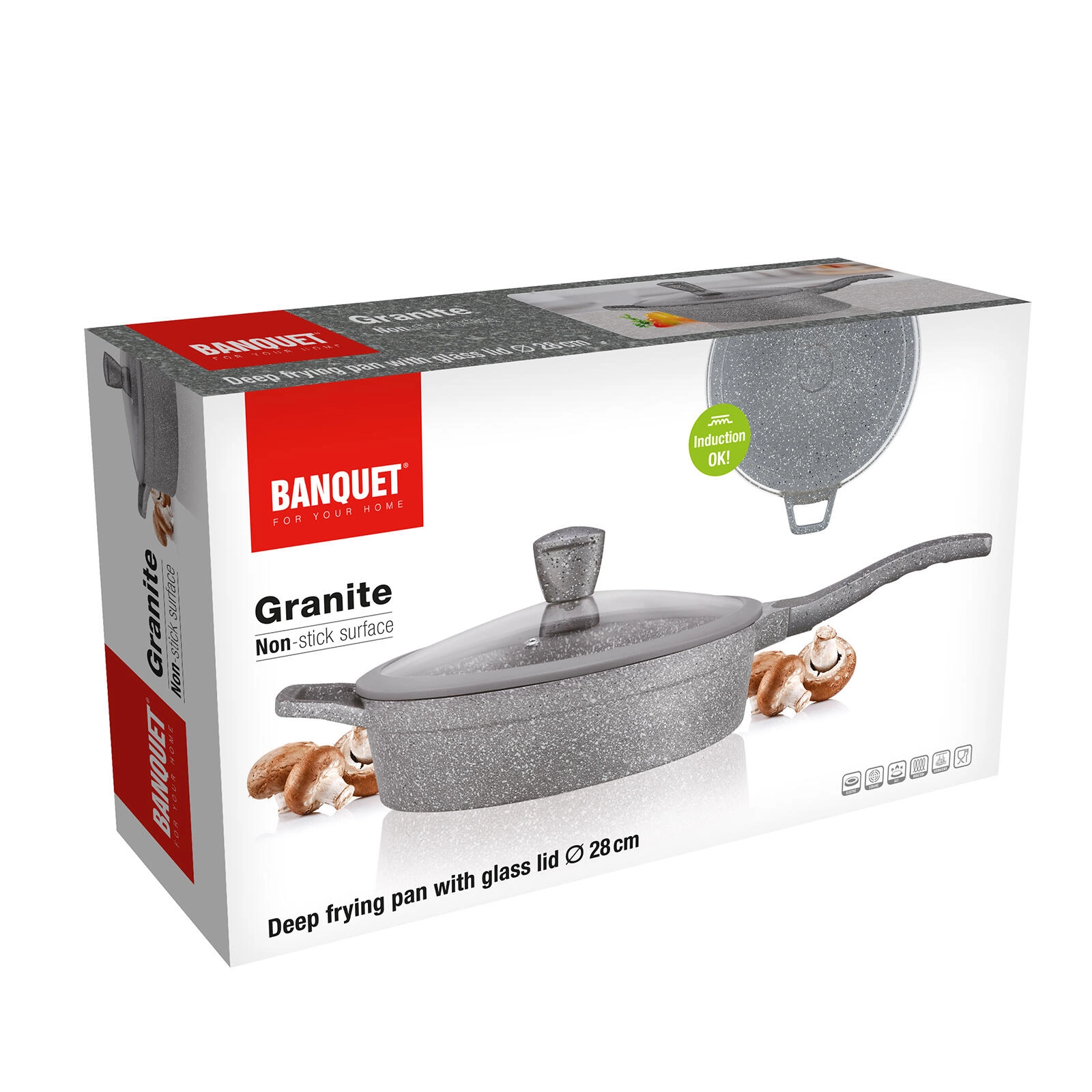 Ta globoka ponev v sivem granitnem dekorju je idealna za praženje, cvrtje in dušenje. Nelepljiva površina zmanjšuje potrebo po olju, preprečuje prijemanje in omogoča lažje čiščenje. Steklen pokrov z gumbom s silikonsko površino omogoča varno rokovanje ter ohranja toploto in vlago v notranjosti ponve.