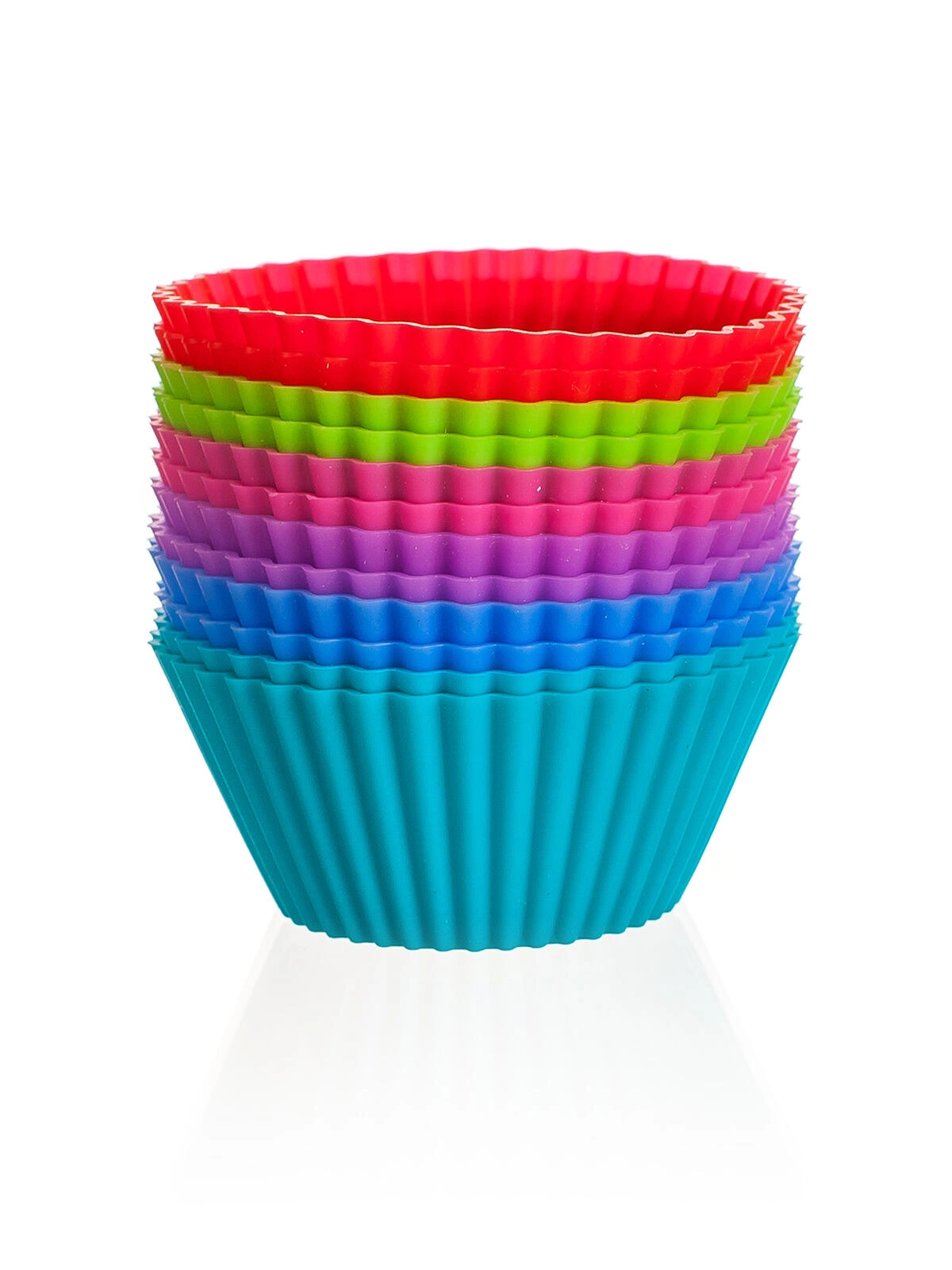 Praktičen komplet 12 silikonskih košaric za peko s premerom 6 cm in višino 2,7 cm v pisani mešanici barv. Enostavno odstranjevanje iz modela, večkratna uporaba, odpornost do 230 °C in možnost pomivanja v pomivalnem stroju naredijo te modelčke idealno izbiro za domačo peko muffinov in cupcakesov.