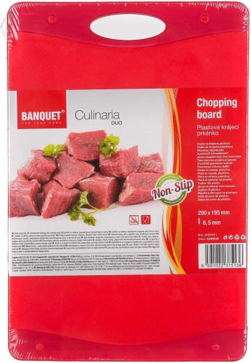 Praktična deska za rezanje CULINARIA DUO z merami 37 × 25,5 cm je izdelana iz trpežne plastike in ponuja protizdrsno obdelavo za varno rezanje. Zahvaljujoč enostavnemu vzdrževanju in združljivosti z jeklenimi in keramičnimi noži je idealna izbira za vsako kuhinjo. Dvobarvna zasnova v dveh odtenkih rdeče bo kuhanju dodala slog.