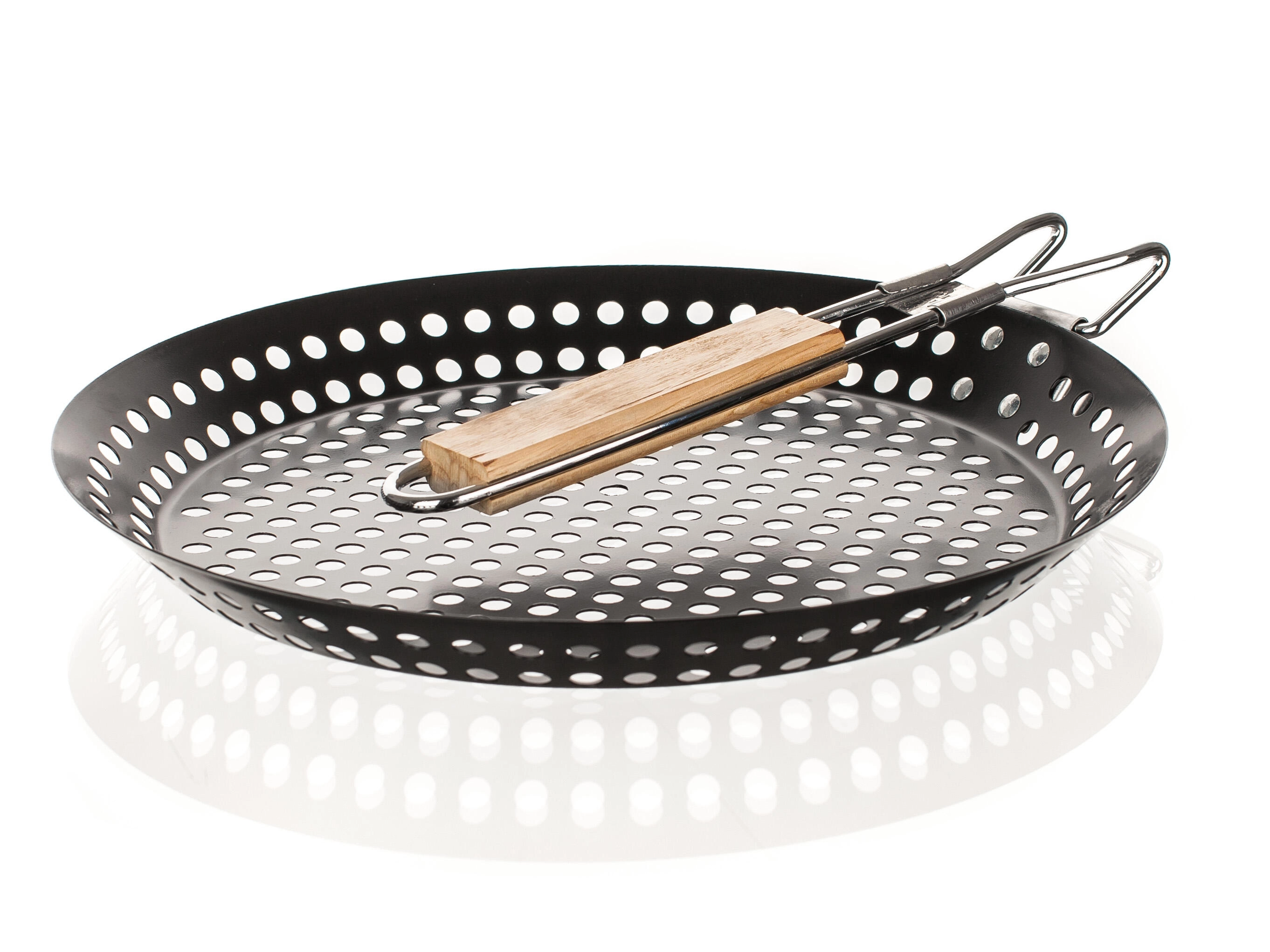 Praktična žar ponev s premerom 31 cm iz trpežnega jekla z nelepljivo prevleko je idealna za ribe, meso in zelenjavo. Zahvaljujoč perforiranemu dnu živila dobijo pristni okus z žara in hkrati ne padejo skozi rešetko. Zložljiv lesen ročaj zagotavlja udobno rokovanje in varen oprijem.