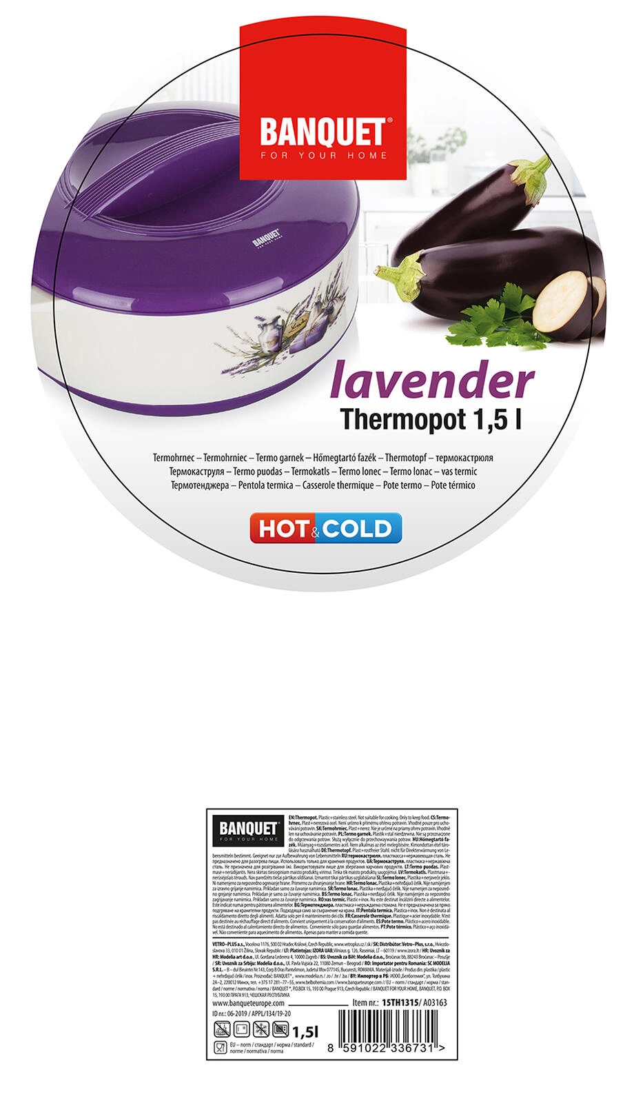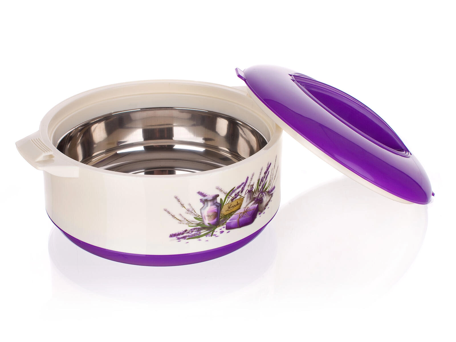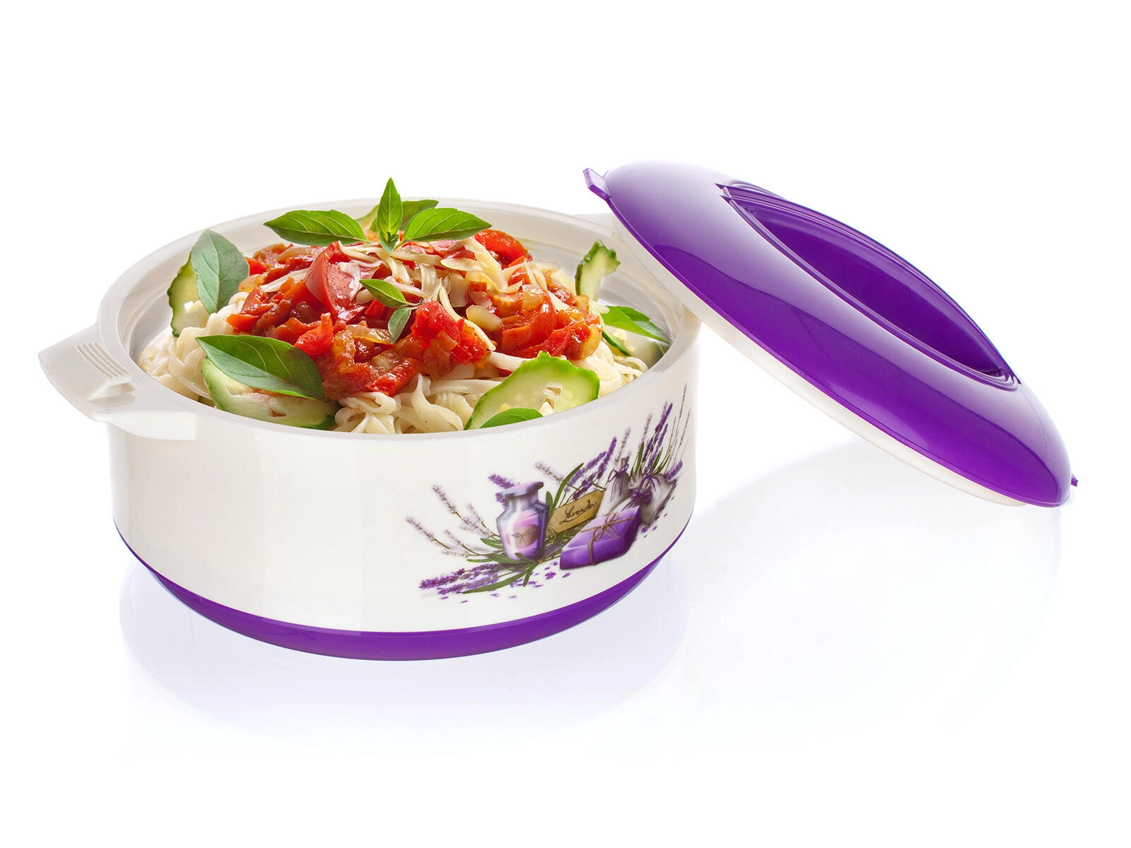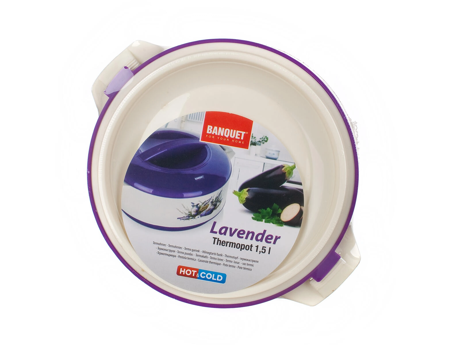 Praktična termoposoda LAVENDER s prostornino 1,5 l ohranja vaše jedi dolgo tople ali hladne zahvaljujoč kakovostni nerjaveči vložki in PUR izolaciji. Eleganten dekor sivke, čvrst pokrov in stranski ročaji olajšajo serviranje ter varno prenašanje jedi.