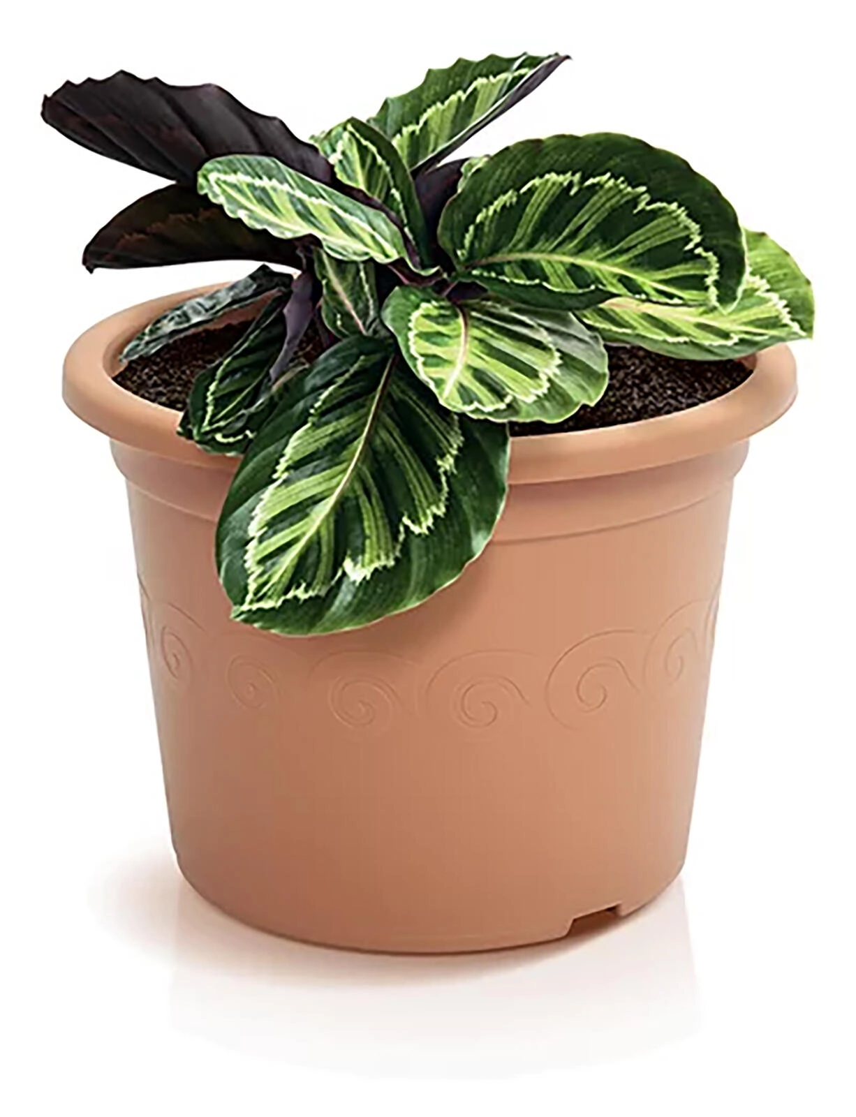 Diskreten reliefni ornament in širok rob dodajata lončku eleganten videz, ki se poda na okensko polico, balkon ali vrt. Vgrajena drenažna odprtina (ali pripravljeno drenažno območje) pomaga preprečevati zastajanje vode pri koreninah in podpira zdravo rast.