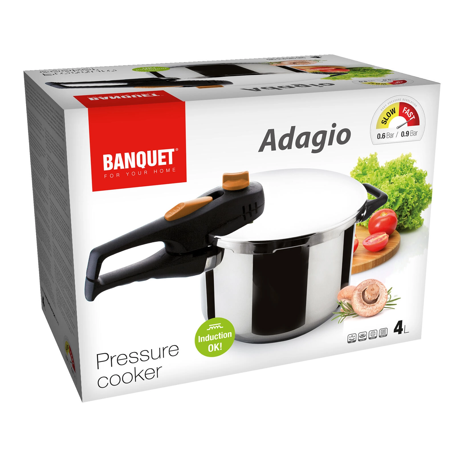 Kompakten tlačni lonec s prostornino 4 l za hitro in varčno kuhanje. Zahvaljujoč nerjavnemu jeklu 18/8, debelu sendvič dnu in varnemu bajonetnemu zapiranju nudi zanesljivo delovanje na vseh vrstah štedilnikov, vključno z indukcijo. Dva delovna tlaka 0,6 / 0,9 bara in silikonsko tesnilo zagotavljata hitre rezultate, sočne jedi in varen pogon.