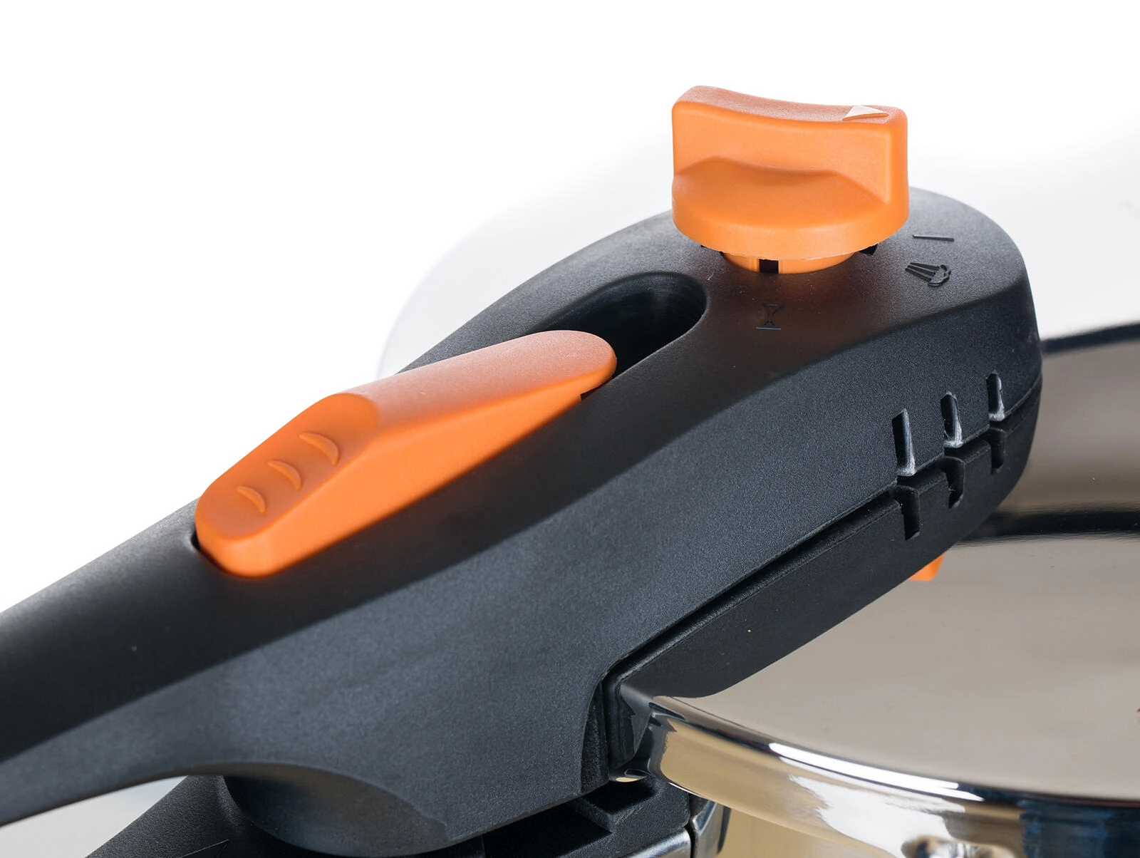 Intuitivno upravljanje tlaka in sproščanja pare zahvaljujoč izrazitim oranžnim elementom na ročaju za pregledno in hitro uporabo.