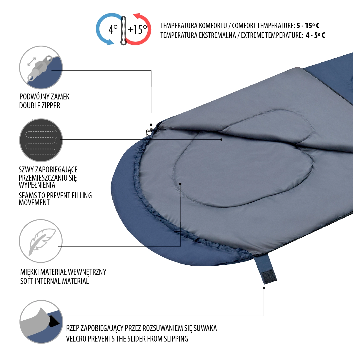 Dolga obojestranska zadrga je zavarovana s široko manšeto z ježkom proti samodejnemu odpenjanju. Vgrajena kapuca z zategovanjem zmanjšuje uhajanje toplote v hladnejših nočeh. Zahvaljujoč zadrgi, ki poteka ob strani in v spodnjem delu, je spalno vrečo mogoče popolnoma odpreti in uporabiti kot odejo – idealna rešitev za toplejše večere in večjo svobodo gibanja.