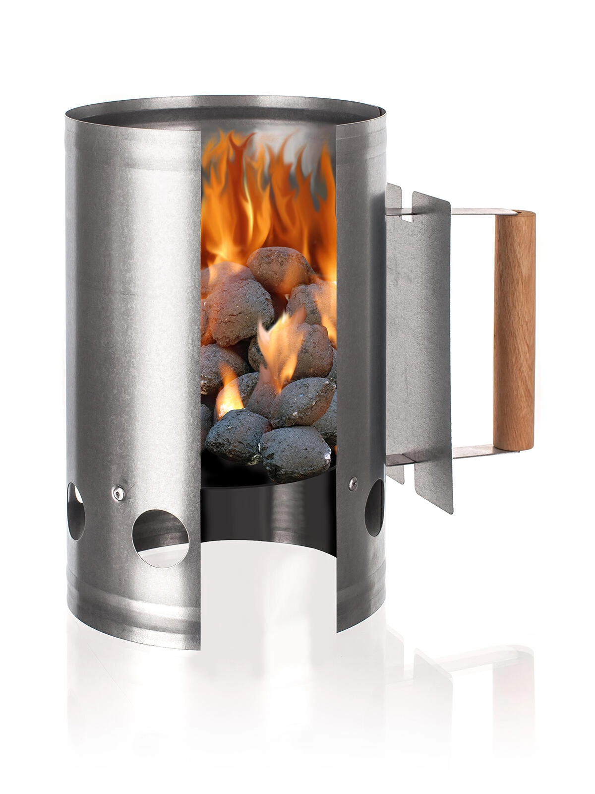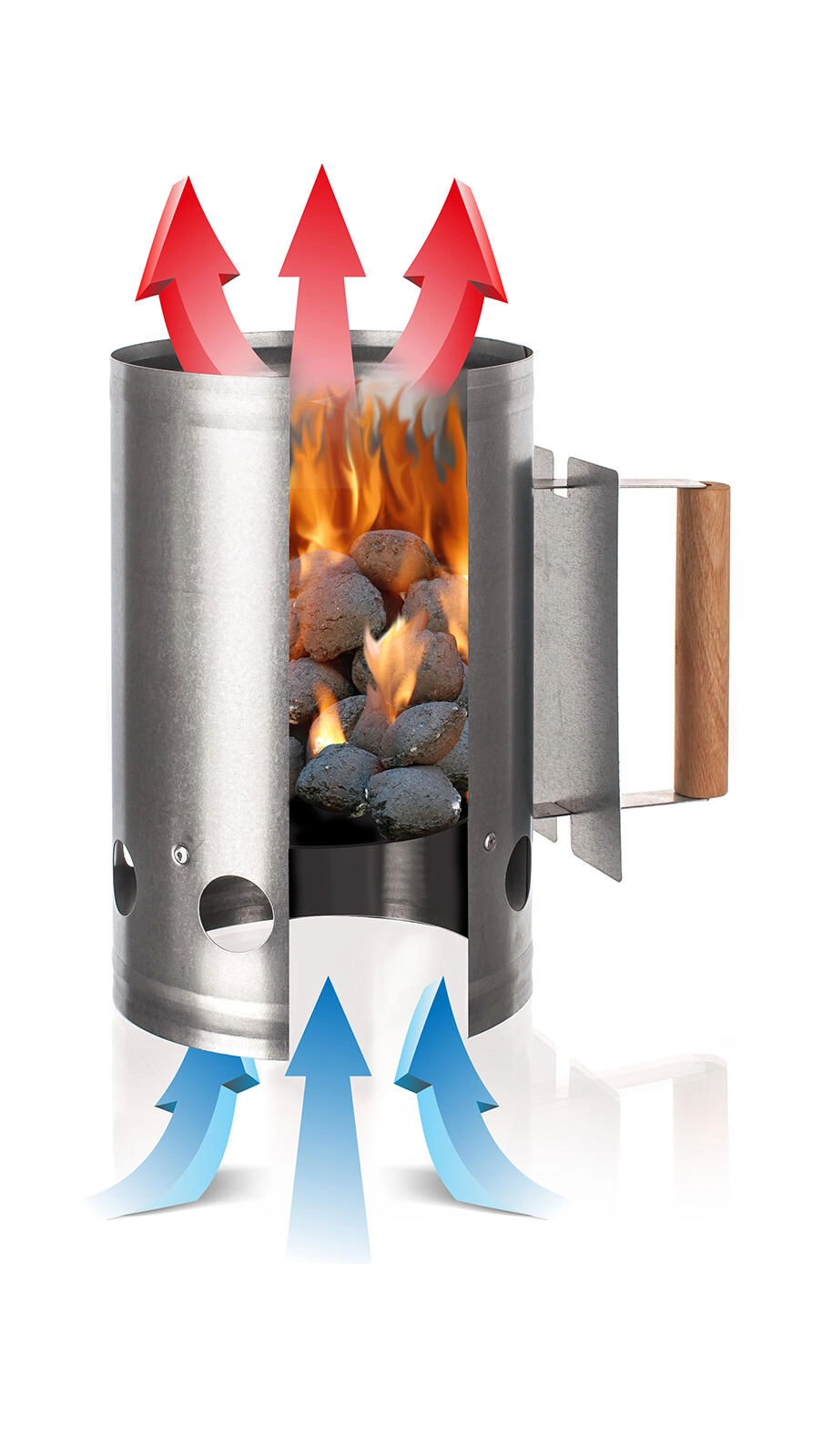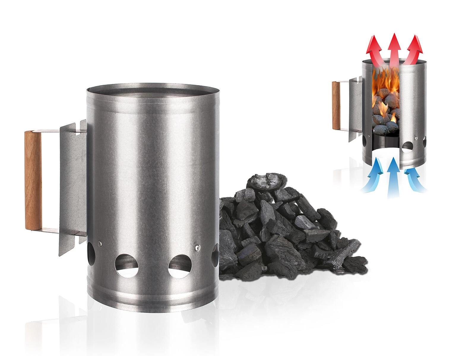 Končano je z dolgotrajnim čakanjem na razžarjene ogljike. Ta pocinkana prižigalna cev s premerom 16,5 cm in višino 28 cm izkorišča dimniški učinek za hitro prežiganje in razžarjanje oglja ter briketov. Zahvaljujoč premišljenim zračnim odprtinam zrak kroži enakomerno, kar pospeši vžig in zmanjša porabo podpalka.