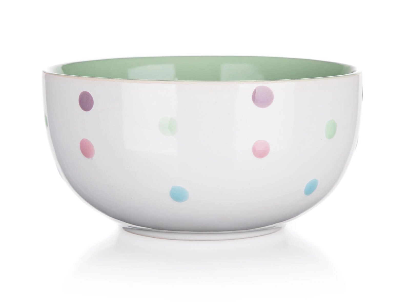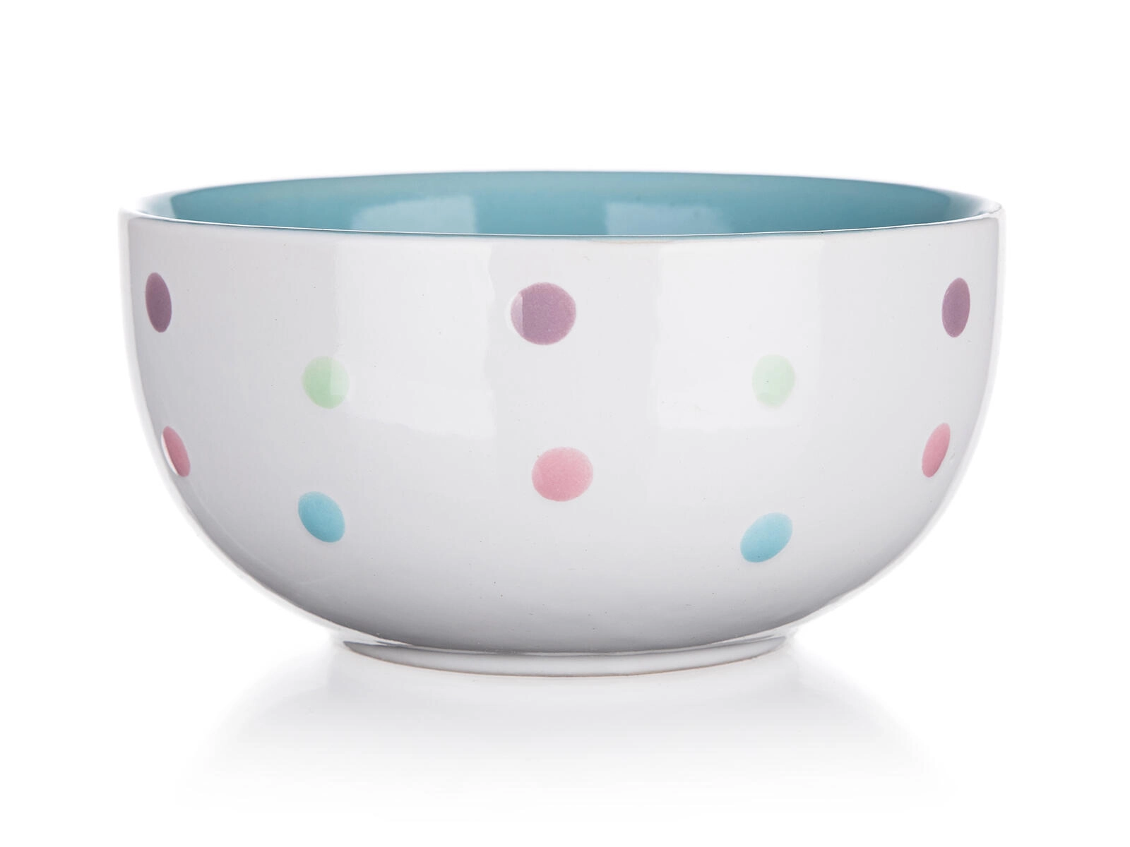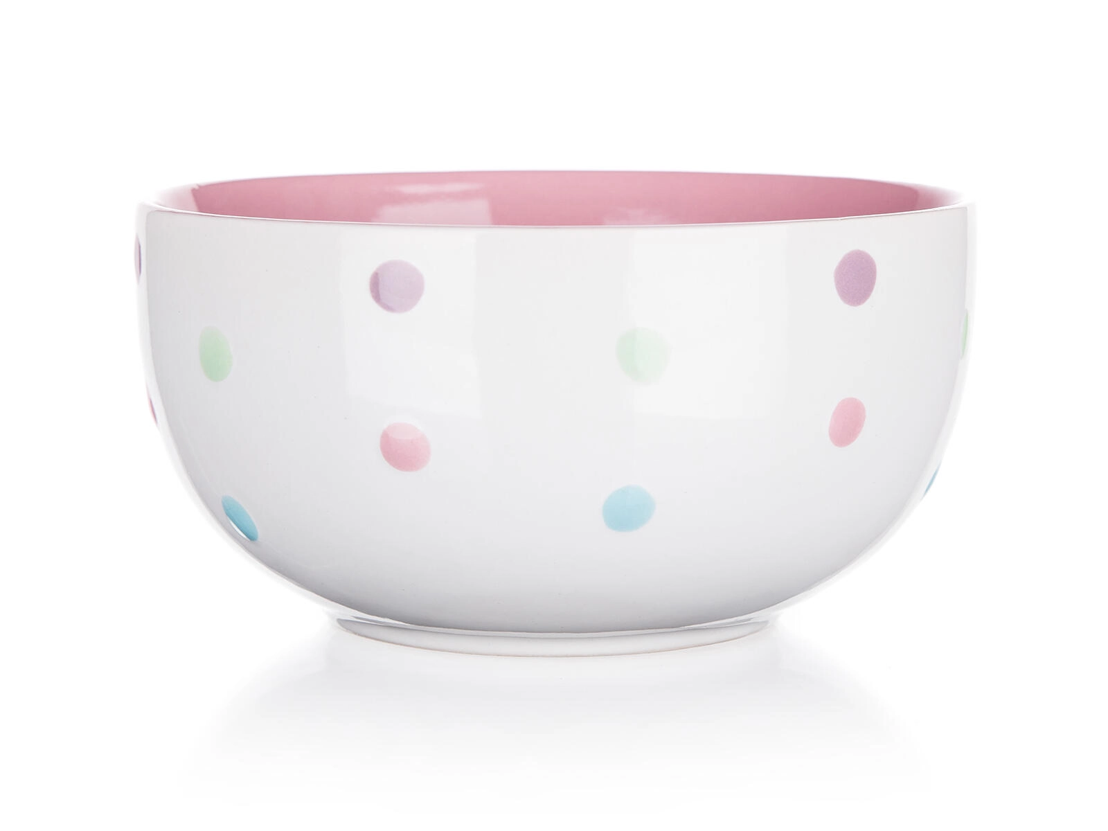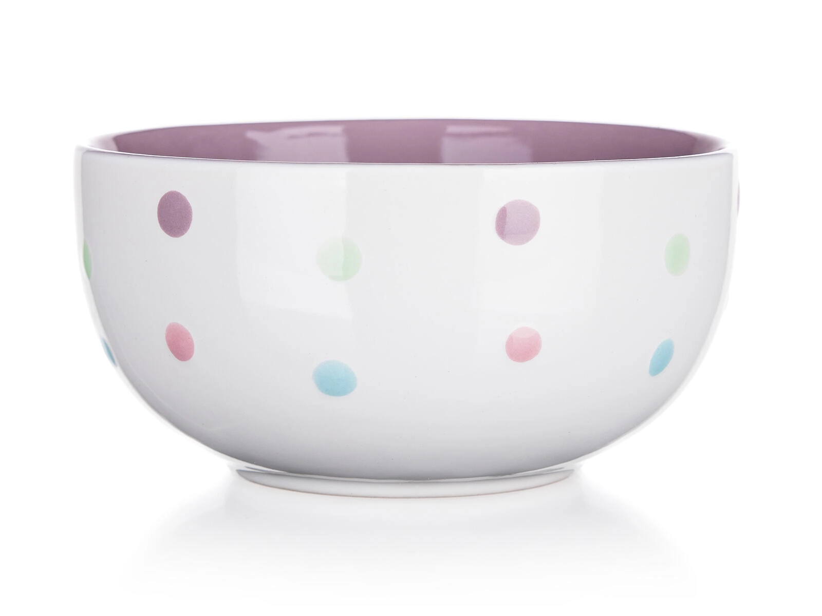 Ta praktična skodela s prostornino 520 ml izstopa z belo osnovo s pastelnimi pikami in barvno notranjostjo (rožnata, vijolična, modra, zelena). Zaradi kakovostne keramike je primerna za serviranje vročih in hladnih jedi, njena gladka glazura pa omogoča enostavno vzdrževanje.