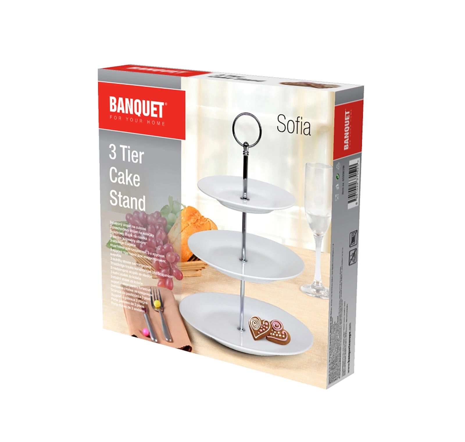 Elegantno trinaštropno stojalo Sofia iz kakovostnega porcelana v beli barvi je idealno za serviranje piškotov, mini tortic in sadja. Zahvaljujoč trem okroglim krožnikom različnih premerov ponuja dovolj prostora, stabilno konstrukcijo in stajliš videz za vsako slavnostno mizo ali domače pogostitve.