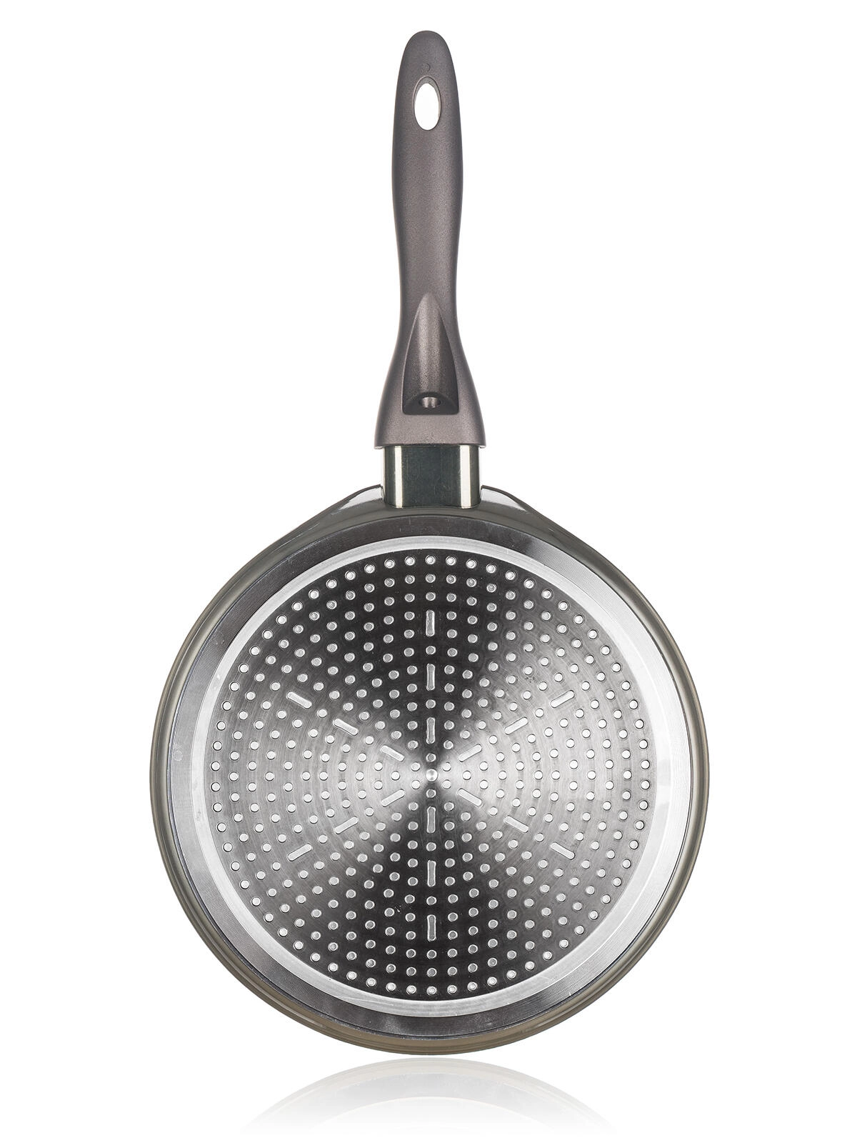 Zunanja karbonska kovinska prevleka daje sodoben videz, medtem ko popolno indukcijsko dno zagotavlja združljivost z vsemi vrstami štedilnikov, vključno z indukcijo. Soft‑touch ročaj nudi varen in udoben oprijem pri obračanju in serviranju.