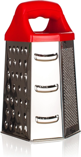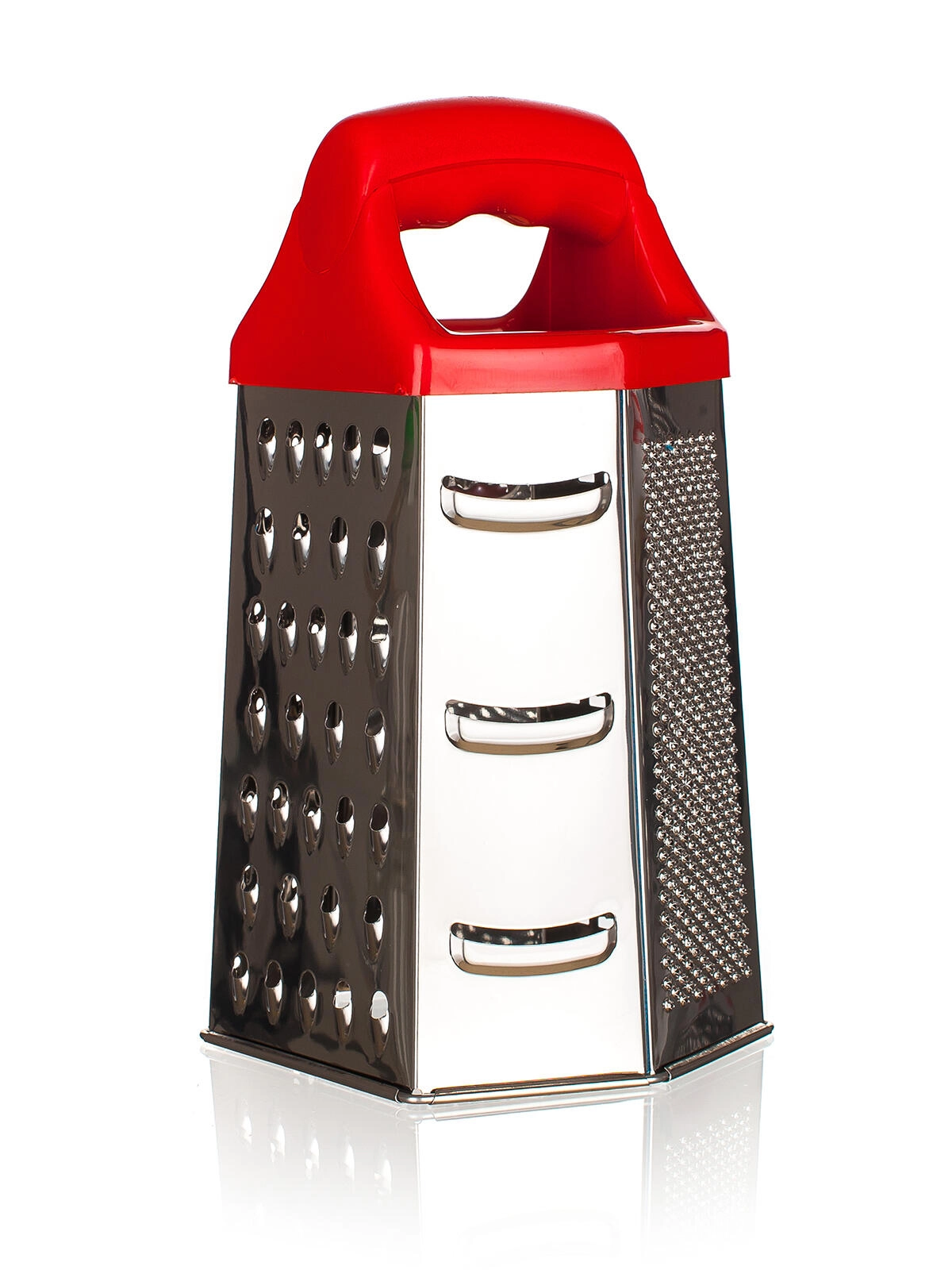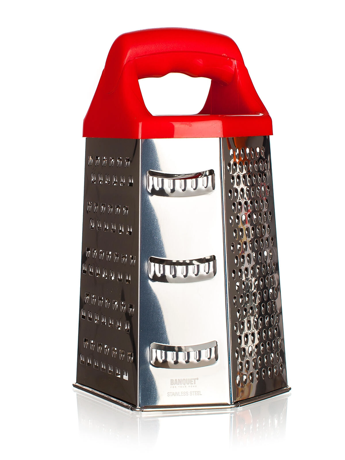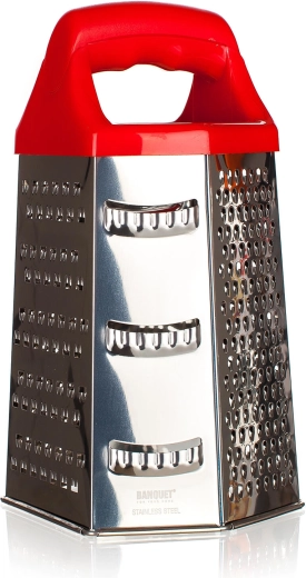 Vsaka stran ponuja drugačno površino: fino, srednje in grobo ribanje ter rezanje na rezine. Idealno za sir, zelenjavo, sadje ali čokolado.