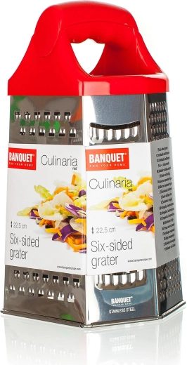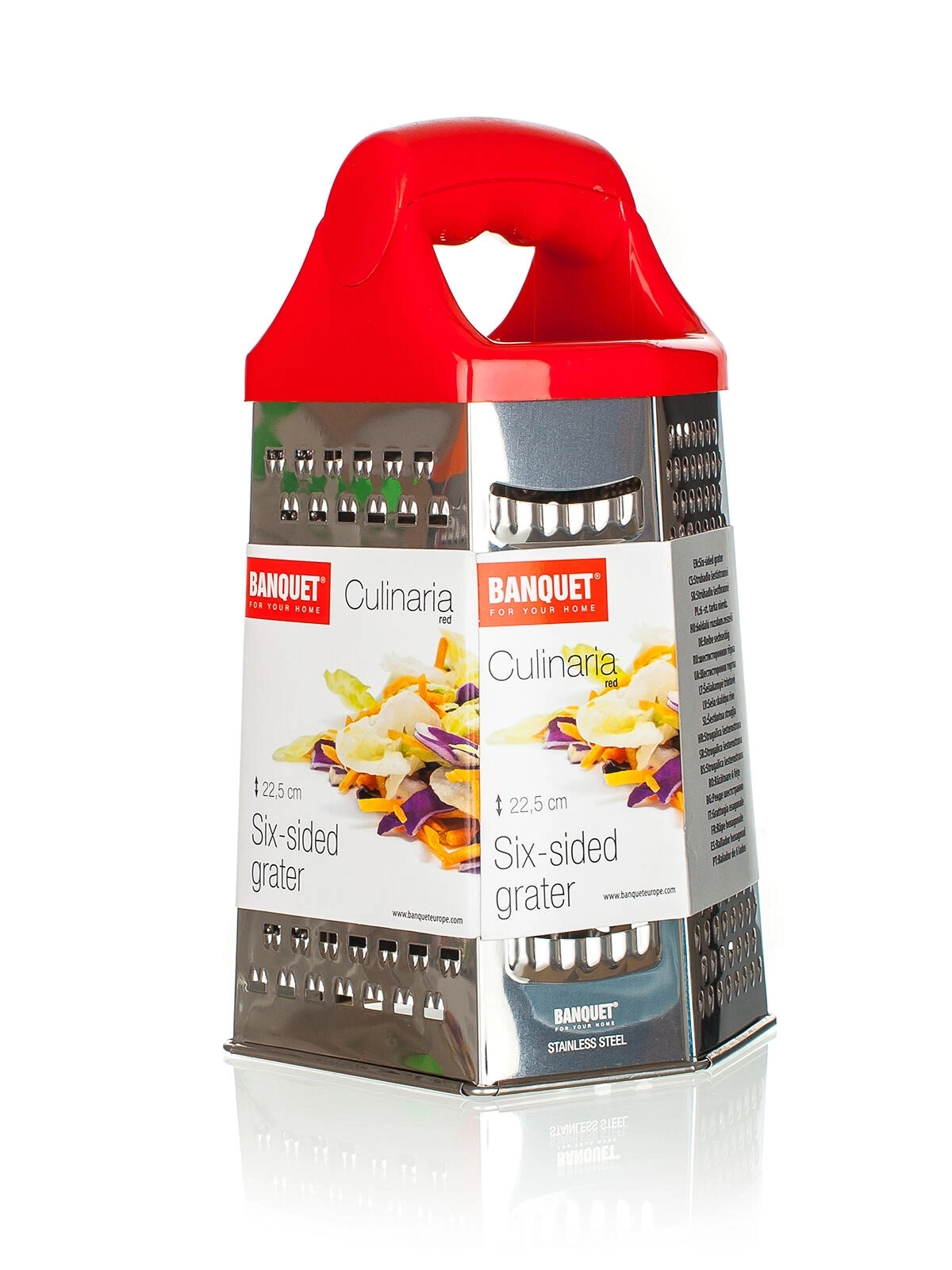 Odkrijte vsestranskega pomočnika za kuhinjo: šeststranski nerjavni ribežen CULINARIA z višino 22,5 cm. Vsaka stran ponuja drugačen tip površine za popolno obdelavo sestavin – od finega praškastega ribanja prek srednjih in grobih nitk do praktičnega rezanja na rezine. Robustno ohišje iz nerjavnega jekla 430 (18/0) in trpežen plastični ročaj iz ABS zagotavljata zanesljiv oprijem, stabilnost in dolgo življenjsko dobo.