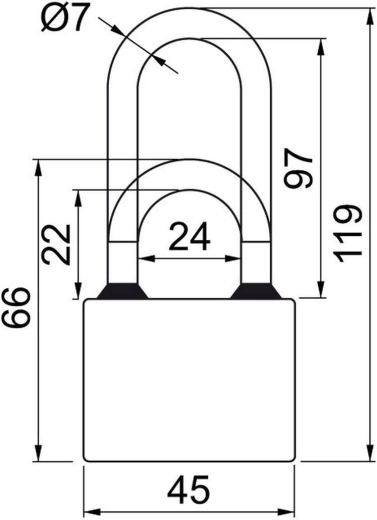Robustno litoželezno ohišje z modrim prašnim premazom zagotavlja dolgo življenjsko dobo tudi pri zahtevnejši uporabi. Podaljšan lok olajša zaklep širših ušes in okovja, dvojni zaklep pa poveča odpornost proti nasilnemu odpiranju. Gumeni obročki zmanjšajo vdor vode v telo ključavnice.