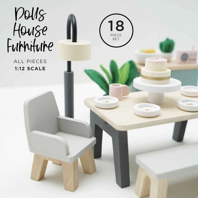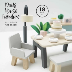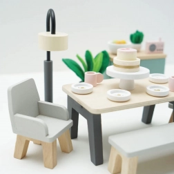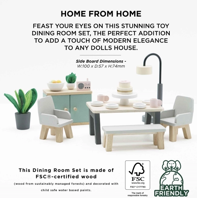 Ta čaroben jedilni komplet je narejen iz kakovostnega lesa s certifikatom FSC in prinaša pridih sofisticiranosti v vsako hiško za punčke. Vsebuje 18 elementov, vključno z mizo, dvema foteljema, klopjo, svetilko, omarico in dekorativnimi dodatki, kot so rastline, skleda s sadjem in torta. Ta komplet ne samo da izgleda čudovito, ampak tudi podpira kognitivne in komunikacijske sposobnosti otrok. Je dekoriran z netoksičnimi barvami na vodni osnovi in je združljiv z drugimi hiškami Le Toy Van Dolls.