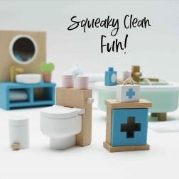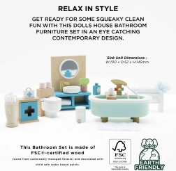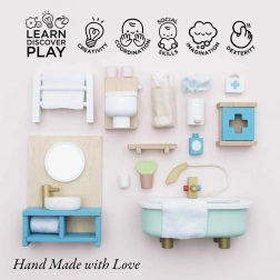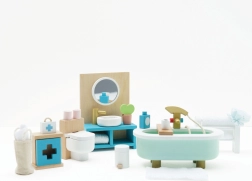 Privoščite hišicam za punčke čar retro kopalnice. Ta skrbno izdelan komplet Daisylane odlično pristaja hišicam LE TOY VAN in drugim hišicam v merilu 1:12. Leseni deli so trpežni, gladko obdelani in ročno dodelani z ekološkimi, z vodo redčljivimi barvami.