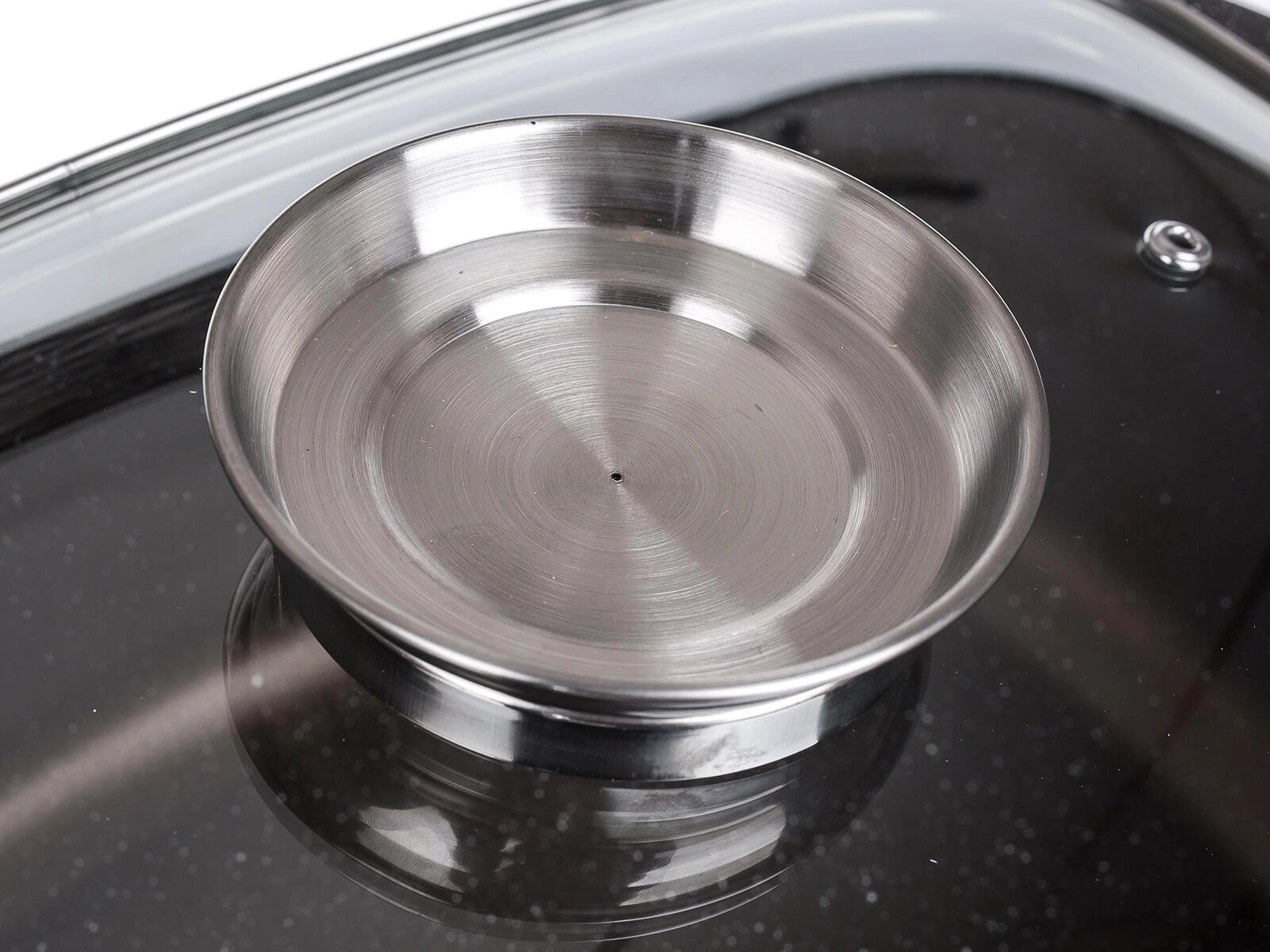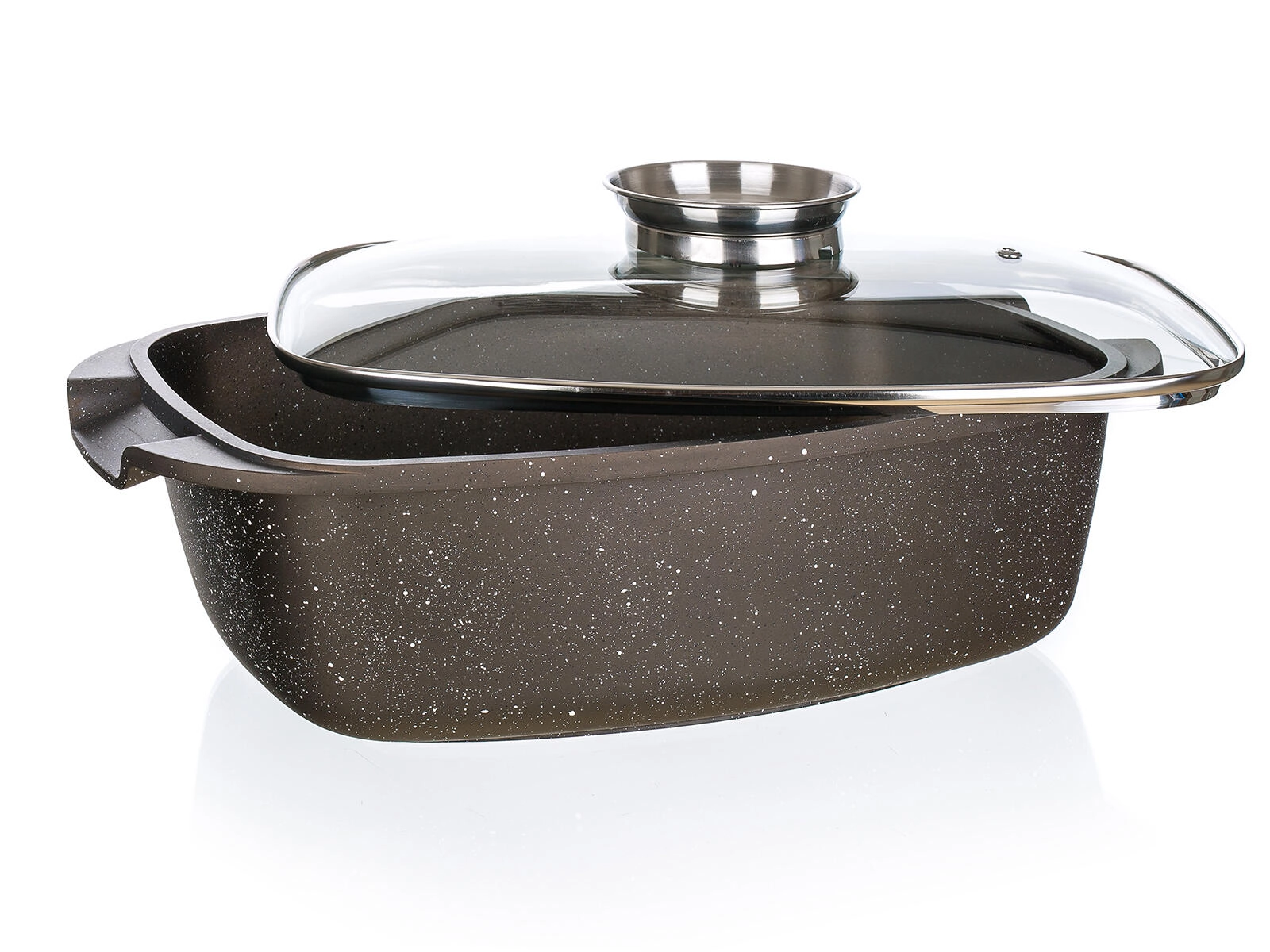 Poseben aroma gumb v pokrovu omogoča sprotno dodajanje jušne osnove, zeliščnih olj ali vina, zato jedi ostanejo sočne in polnega okusa. Zahvaljujoč popolnoma indukcijskemu dnu je pekač združljiv z vsemi vrstami kuhalnih plošč – elektrika, plin, steklokeramika in indukcija – ter ga lahko brez skrbi uporabljate tudi v pečici in pomivate v pomivalnem stroju.