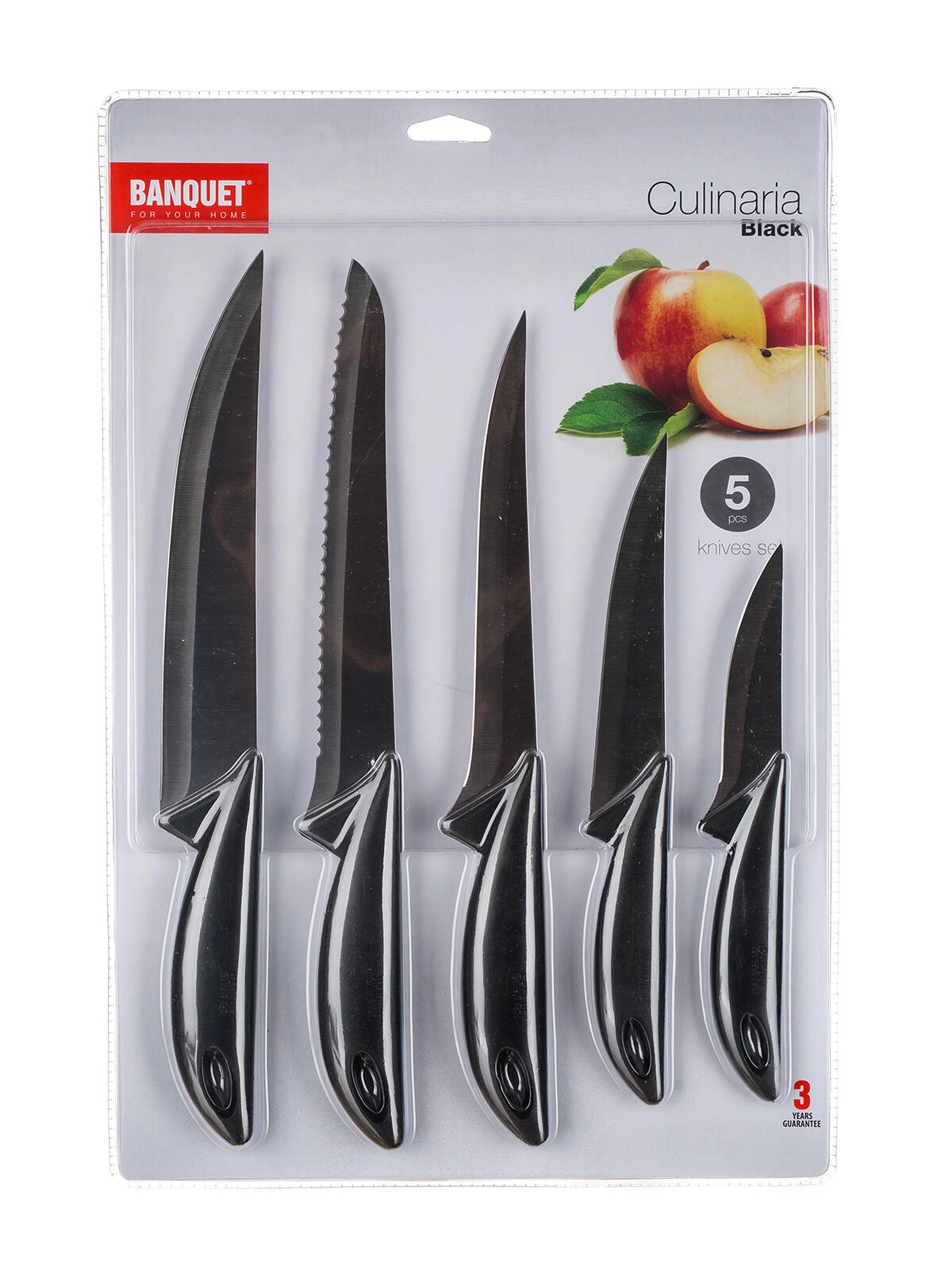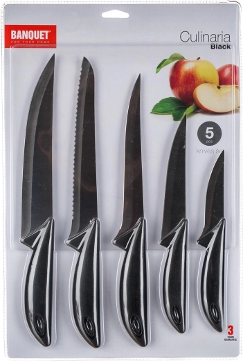 Univerzalni set kuhinjskih nožev Culinaria (5 delov) za vsakodnevno kuhanje. Vsebuje praktične nože za rezanje in razrez, vključno z nožem za kruh in kostnim/izkoščičevalnim nožem. Trpežni jekleni rezili in udoben črn ročaj zagotavljajo natančno in varno rezanje.