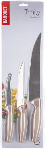 S tem 3-delnim setom nožev TRINITY CULINARIA boste kos vsem opravilom od nežnega rezanja do porcioniranja mesa. Jeklena rezila omogočajo oster in stabilen rez, udobni ročaji v rjavi barvi pa olajšajo vsakodnevno delo v kuhinji.