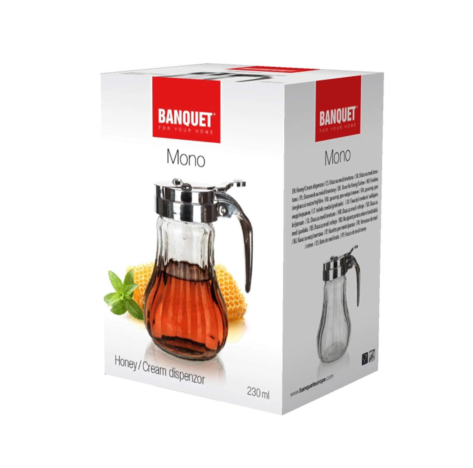 Praktična steklena doza MONO s prostornino 230 ml je idealna za med, smetano ali sirup. Kombinacija odpornega stekla, nerjavečega pokrova in silikonskega tesnila zagotavlja čisto točenje brez kapljanja, dolgo življenjsko dobo in eleganten videz na vsaki mizi.