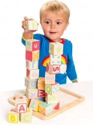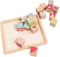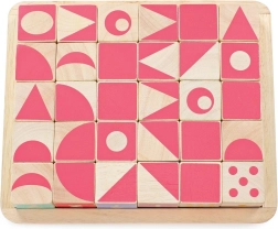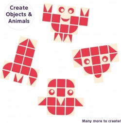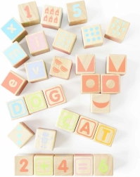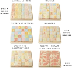 Zaobljeni robovi kock in odlagalne deske zagotavljajo udobno in varno rokovanje. Igrača je brez plastike, izdelana iz FSC certificiranega lesa z poudarkom na etični proizvodnji in trajnosti. Set podpira razvoj kognitivnih spretnosti, prostorske predstavljivosti in jezikovnih sposobnosti.