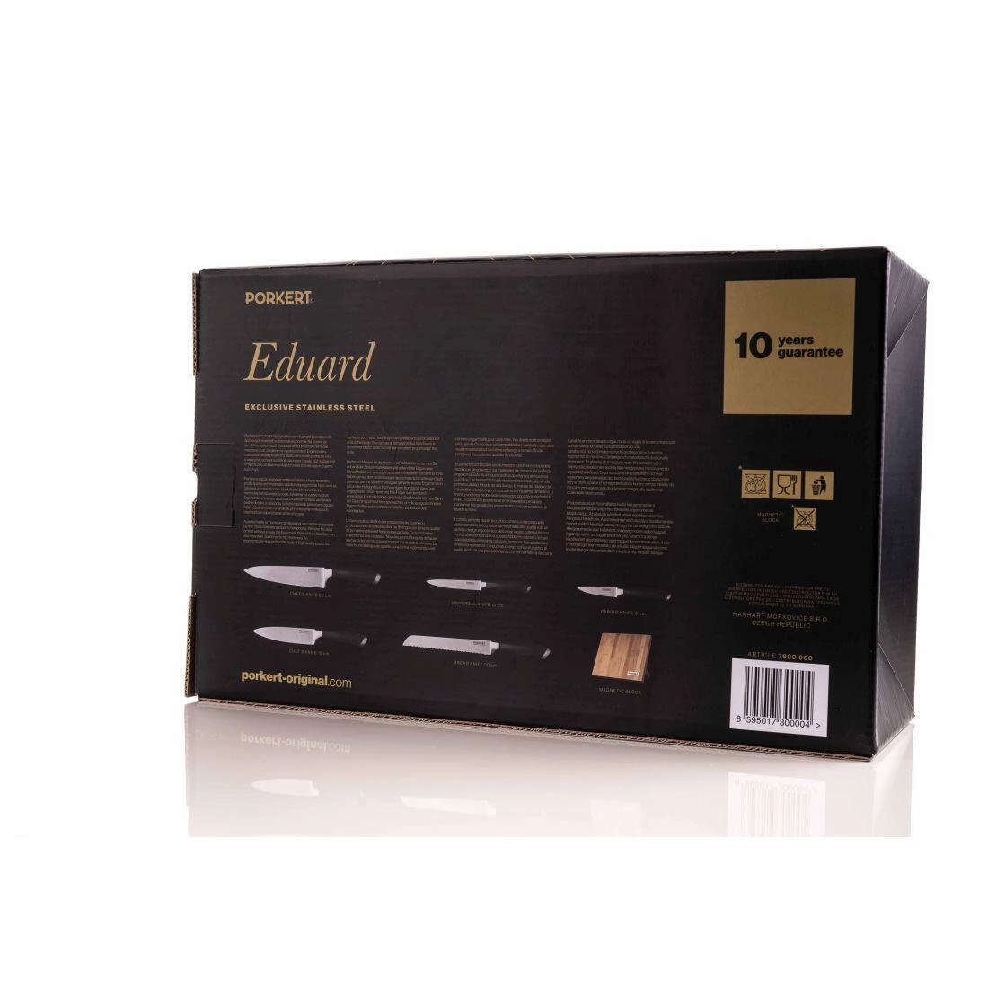 Univerzalni set nožev EDUARD je zasnovan tako, da pokrije vsa običajna kuhinjska opravila – od rezanja hrustljavega kruha do nežnega rezanja mesa na rezine. Rezila iz jekla X50CrMoV15 (ISO 1.4116) s trdoto HRC 55 ±2 dobro držijo ostrino, enostavna so za vzdrževanje in omogočajo gladek rez brez trganja.
