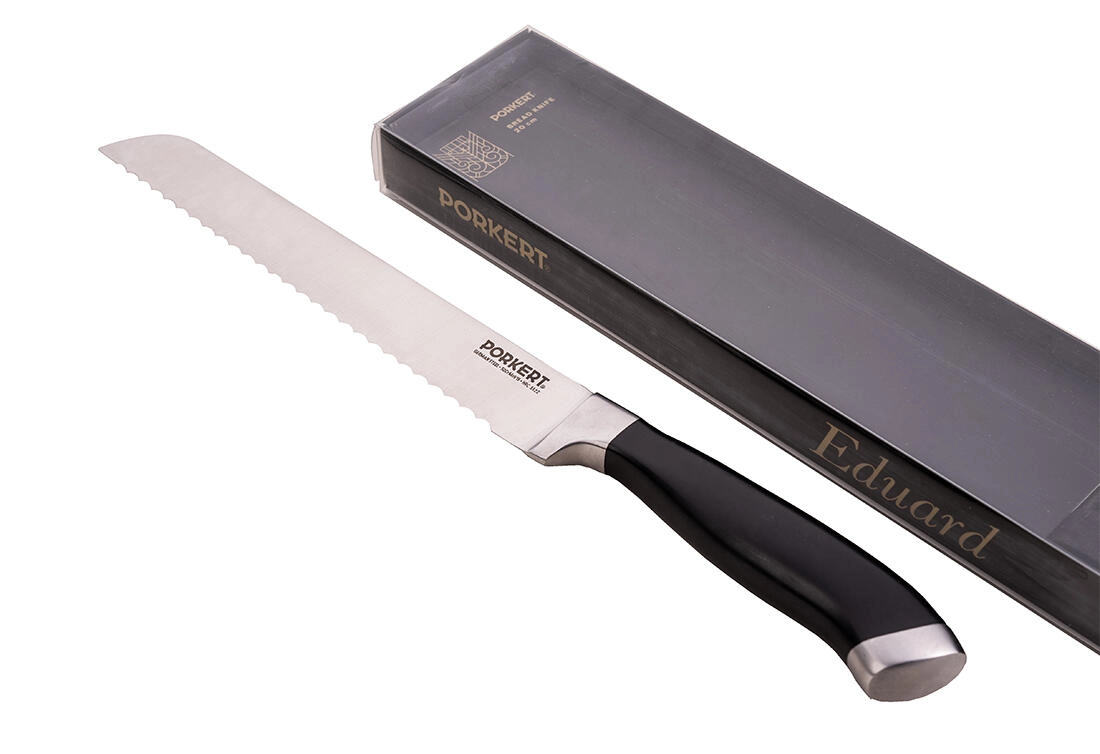 Nož za kruh EDUARD je zasnovan za natančno rezanje pekovskih izdelkov – od hrustljavih baget do svežega kruha. Kakovostno rezilo iz jekla X50CrMoV15 (ISO 1.4116) s trdoto HRC 55 ±2 ponuja zanesljivo ostrino in odpornost proti obrabi. Poliran plastičen ročaj dobro leži v roki ter povečuje udobje in varnost pri rezanju.