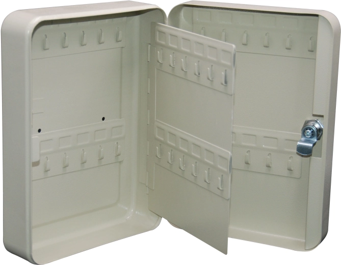 Praktična omarica za ključe za do 48 ključev zagotavlja pregledno in varno shranjevanje v vašem domu, pisarni ali obratu. Je zaklenljiva in jo je mogoče preprosto namestiti na steno. Kompaktne mere 250 × 180 × 75 mm in univerzalna siva barva se podajo v vsak interier.