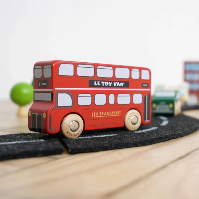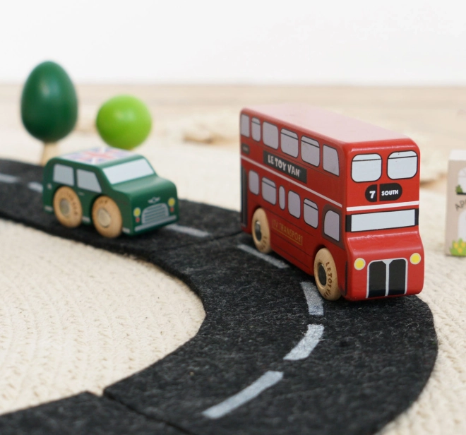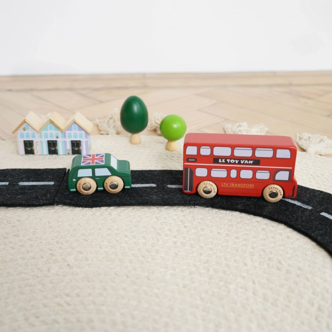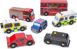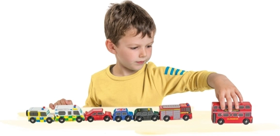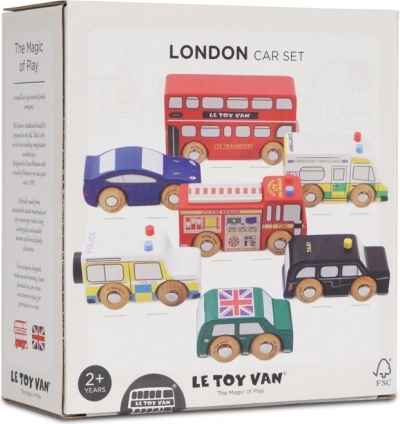 Odkrijte svet živahnih londonskih ulic s podrobno izdelanimi lesenimi vozili Le Toy Van. Komplet vključuje dvonadstropni avtobus, črni taksi, gasilski avto, reševalno vozilo, policijski avto in dva osebna avtomobila. Robustna izvedba iz trajnostnega kavčukovega lesa ter gladki robovi so idealni za male otroške roke, ki pri igri urijo prijem, koordinacijo roka–oko in domišljijo.