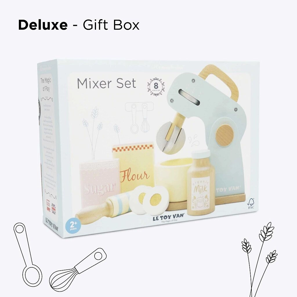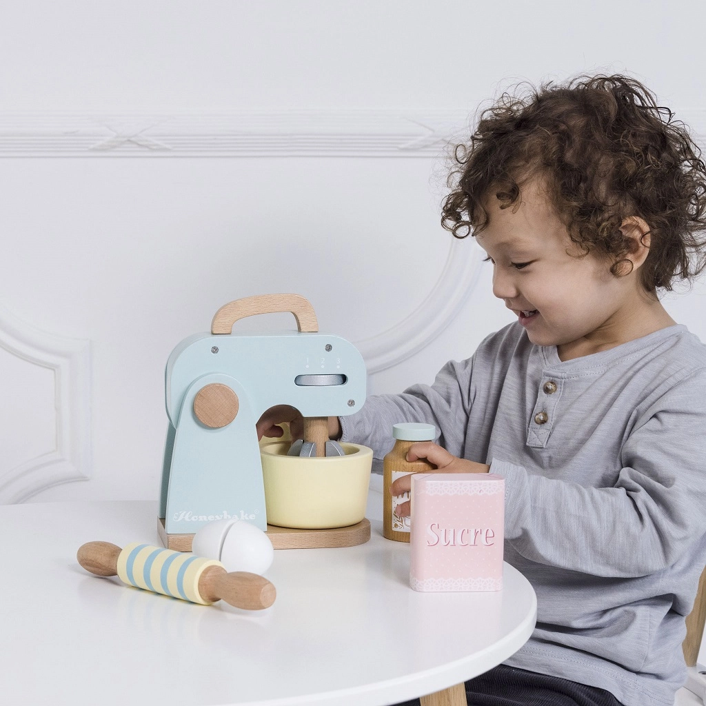 Stilski kuhinjski robot Le Toy Van otrokom prinaša pristno izkušnjo peke v njihovi otroški kuhinji. Z vrtljivo metlico, lesenim valjarjem in skledo si lahko »spečejo« torto, piškote ali kolač. Pastelne barve in retro dizajn so prava paša za oči, kakovostna lesena izvedba pa zagotavlja dolgo življenjsko dobo.