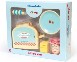 Leseni komplet Honeybake znamke LE TOY VAN spremeni otroški kotiček v prijetno kuhinjico. Otroci bodo vzljubili realistični toaster z vzmetjo, iz katerega po pritisku poskočita dve rezini »tosta«. Maslo s spojem na ježek uči pravilnega prijema in dela z nožkom, kozarec jagodne marmelade in krožniček pa dopolnita vsako igrivo zajtrkovanje.