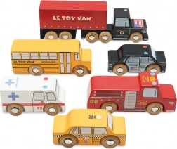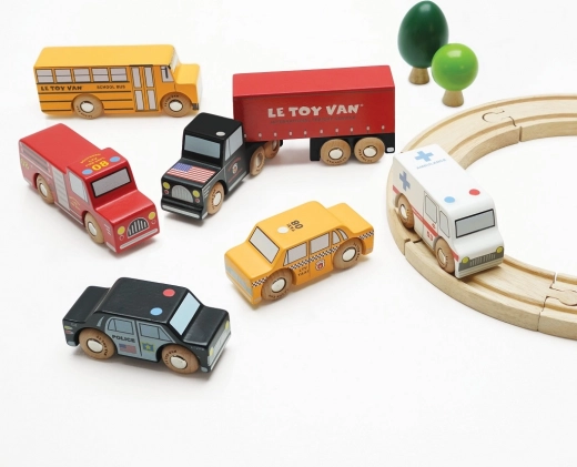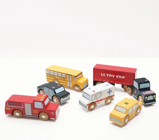 Ta barvita kolekcija vsebuje zgibni tovorni avto z desetimi kolesi, rumeni šolski avtobus, policijski avto, rumeni taksi, reševalno vozilo in gasilski avto. Skrbno izdelani detajli in gladko vrteča se kolesa otroke spodbujajo k odprti igri, pri kateri ustvarjajo zgodbe in urijo koordinacijo oko–roka.