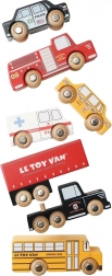 Šolski avtobus, gasilski avto, reševalno vozilo, policijski avto, taksi in zgibni tovornjak tvorijo pisan komplet, ki navdihuje zgodbe z živahnih mestnih ulic.